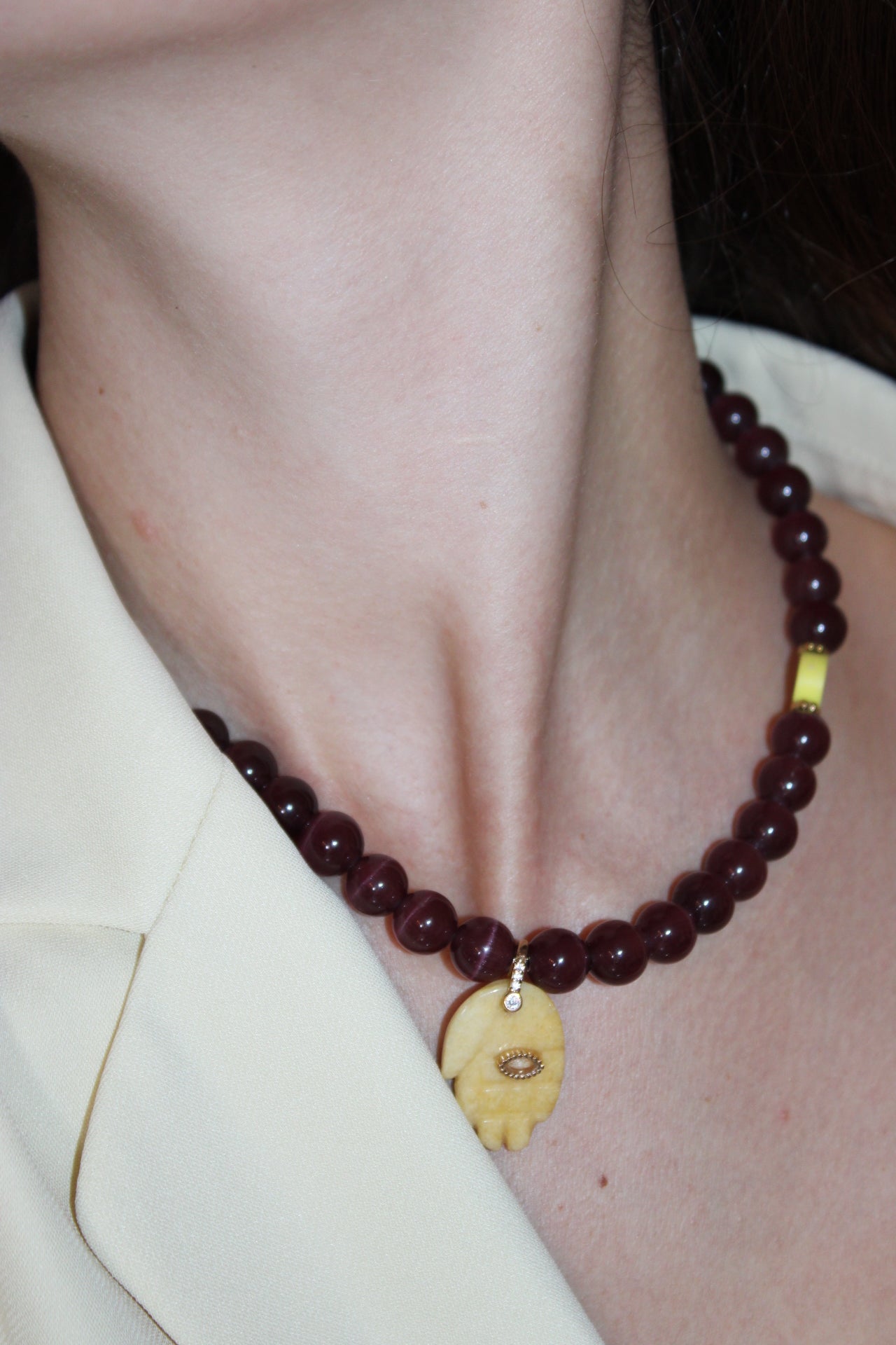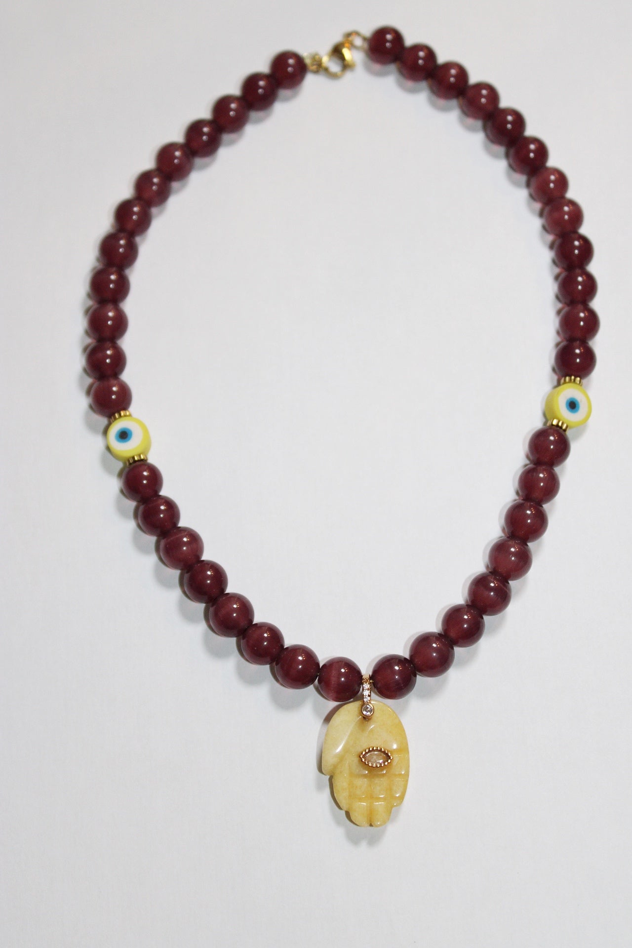 Collier en perles rondes couleur prune et pendentif de la main en jaune, confectionné à la main avec soin dans un atelier de création de bijoux. Ce bijou élégant et intemporel combine la sobriété des perles vertes de péridot, et l'originalité du piment en verre, apportant une touche de personnalisation.