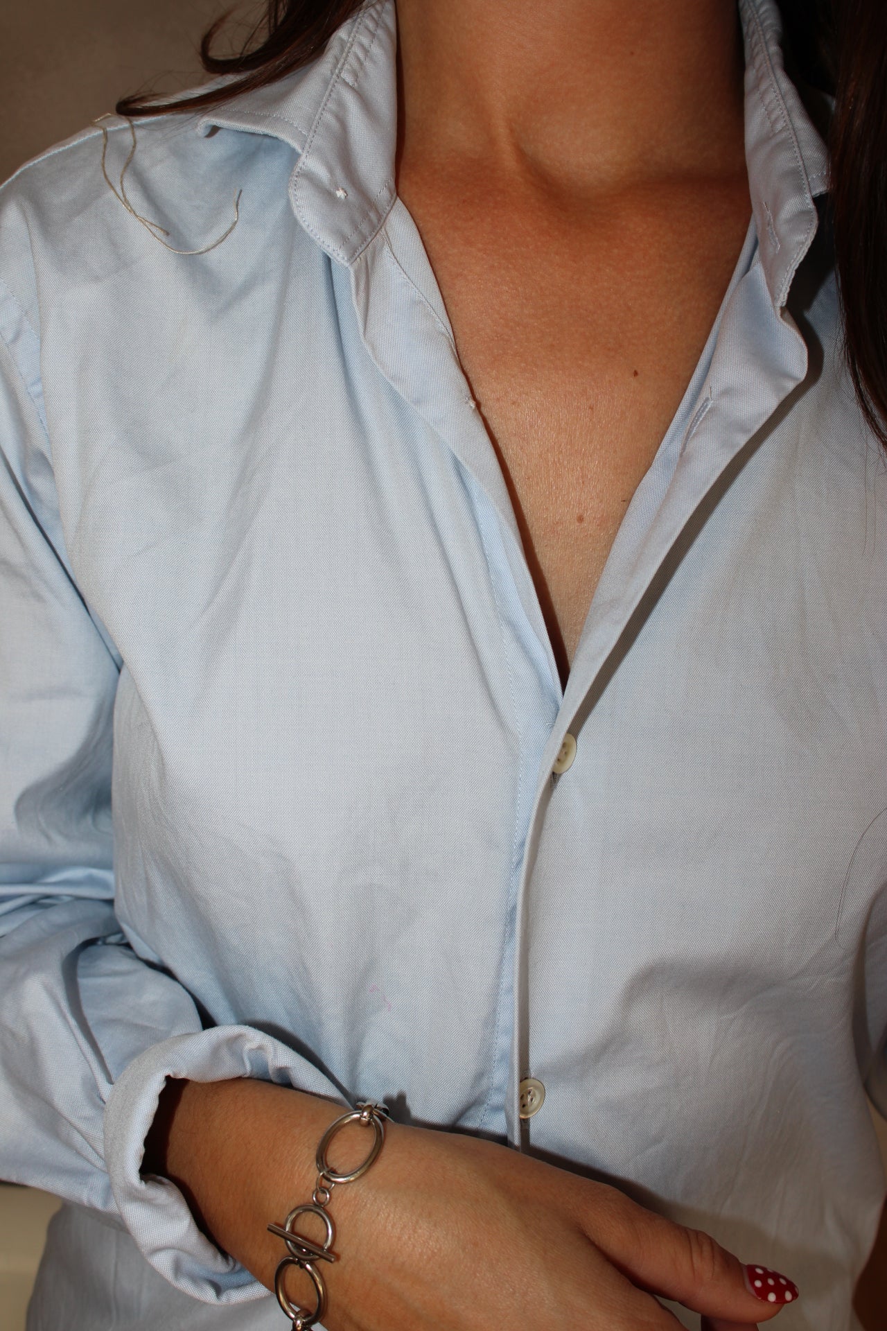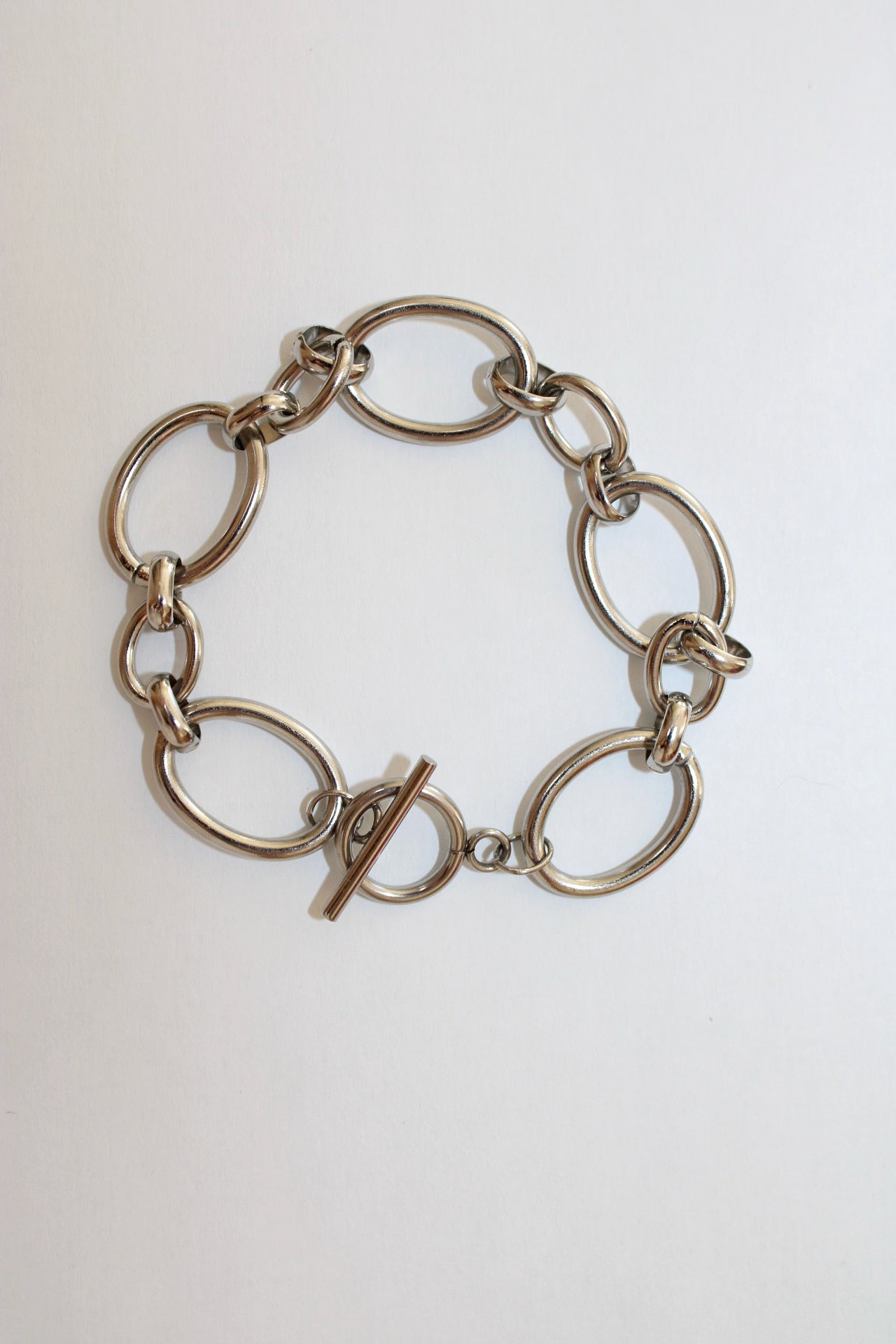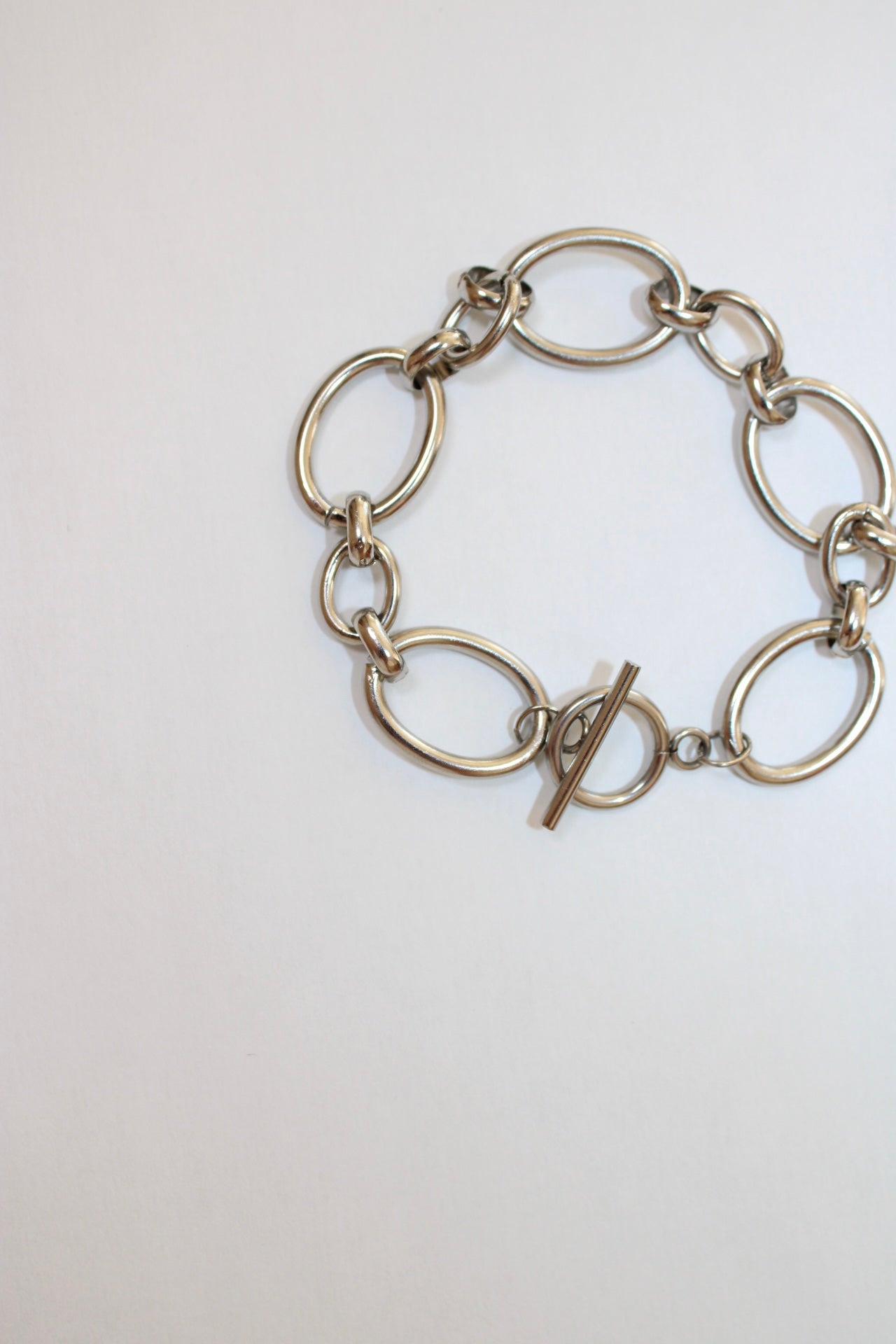 Craquez pour ce bracelet tendance en chaîne argent fabriqué en acier inoxydable, orné d'un fermoir togle en acier inoxydable qui apporte une touche de fantaisie chic.