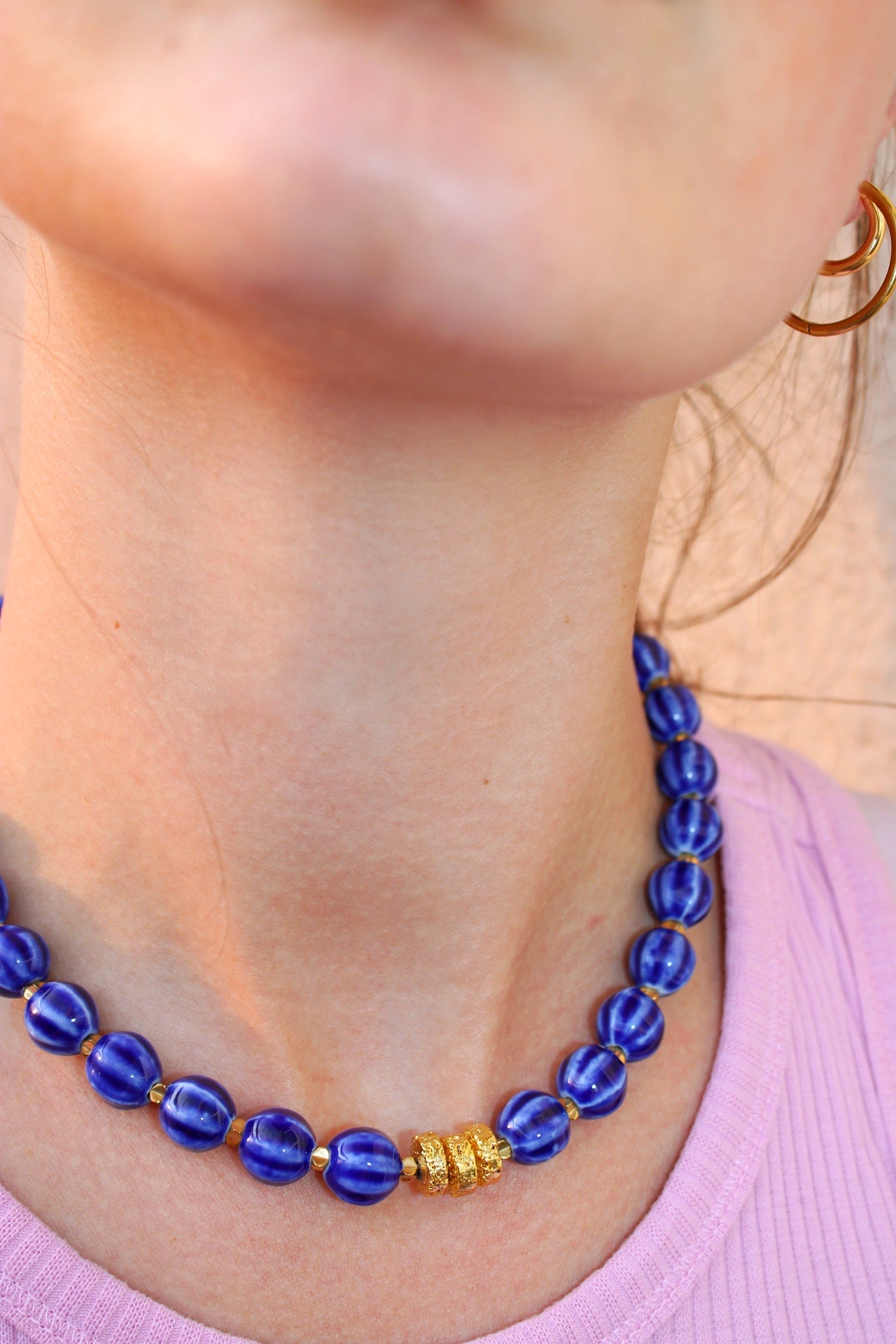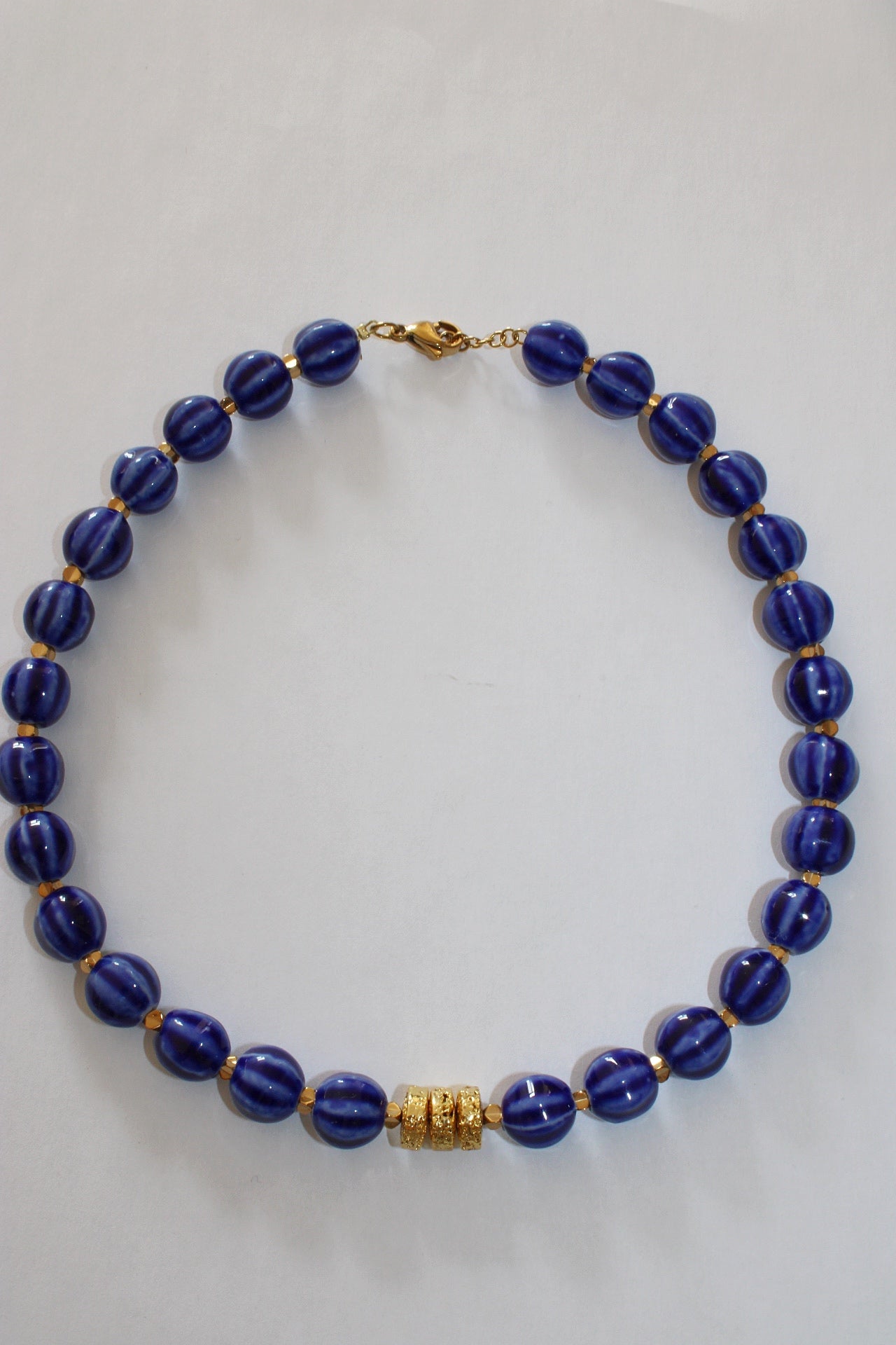 Collier fantaisie composé de perles de céramique à rayures bleu roi, originales et lumineuses, façonnées en forme de citrouille pour un style unique et plein de charme. Ce collier coloré au design artisanal apporte une touche tendance et créative à toutes les tenues. L’éclat du bleu roi, associé à la texture élégante des perles de céramique, en fait un bijou fantaisie moderne, idéal pour celles qui recherchent un accessoire original, vibrant et féminin. Un collier en perles de céramique parfait pour offrir ou compléter une collection d’accessoires uniques.