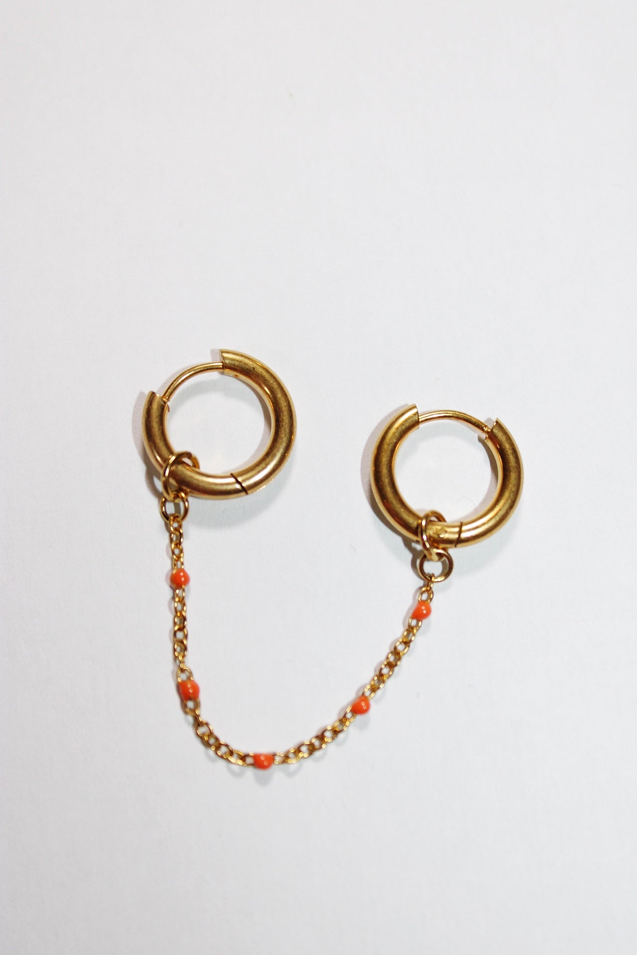 Ces boucles d'oreilles en acier inoxydable allient élégance et originalité. Leur design en chaînettes dorées est rehaussé de touches orange , apportant une note dynamique et festive à votre look. Légères et confortables, elles se portent aussi bien au quotidien que lors d'occasions spéciales. Un bijou fantaisie parfait pour ajouter une touche de couleur et de modernité à votre style !