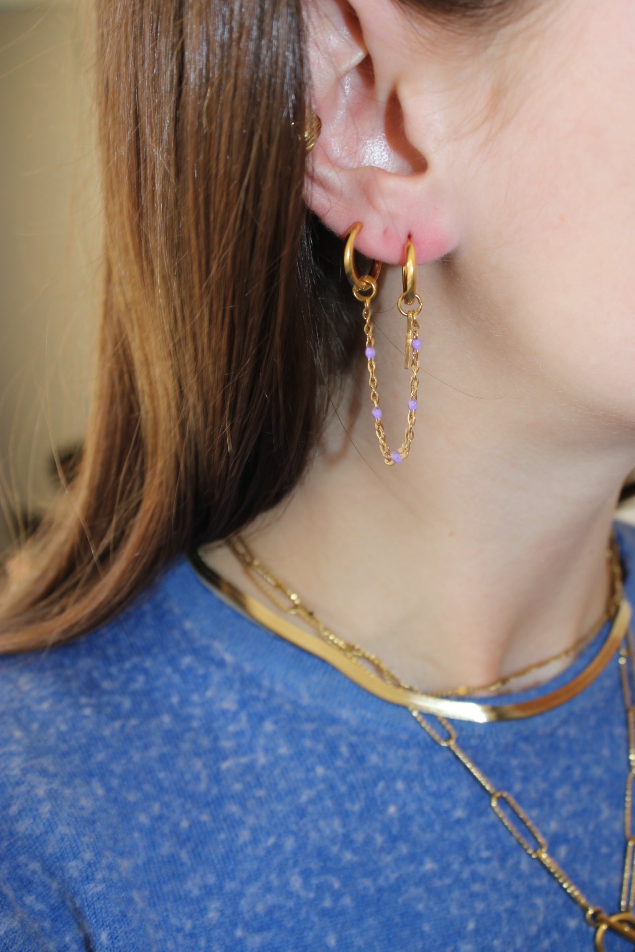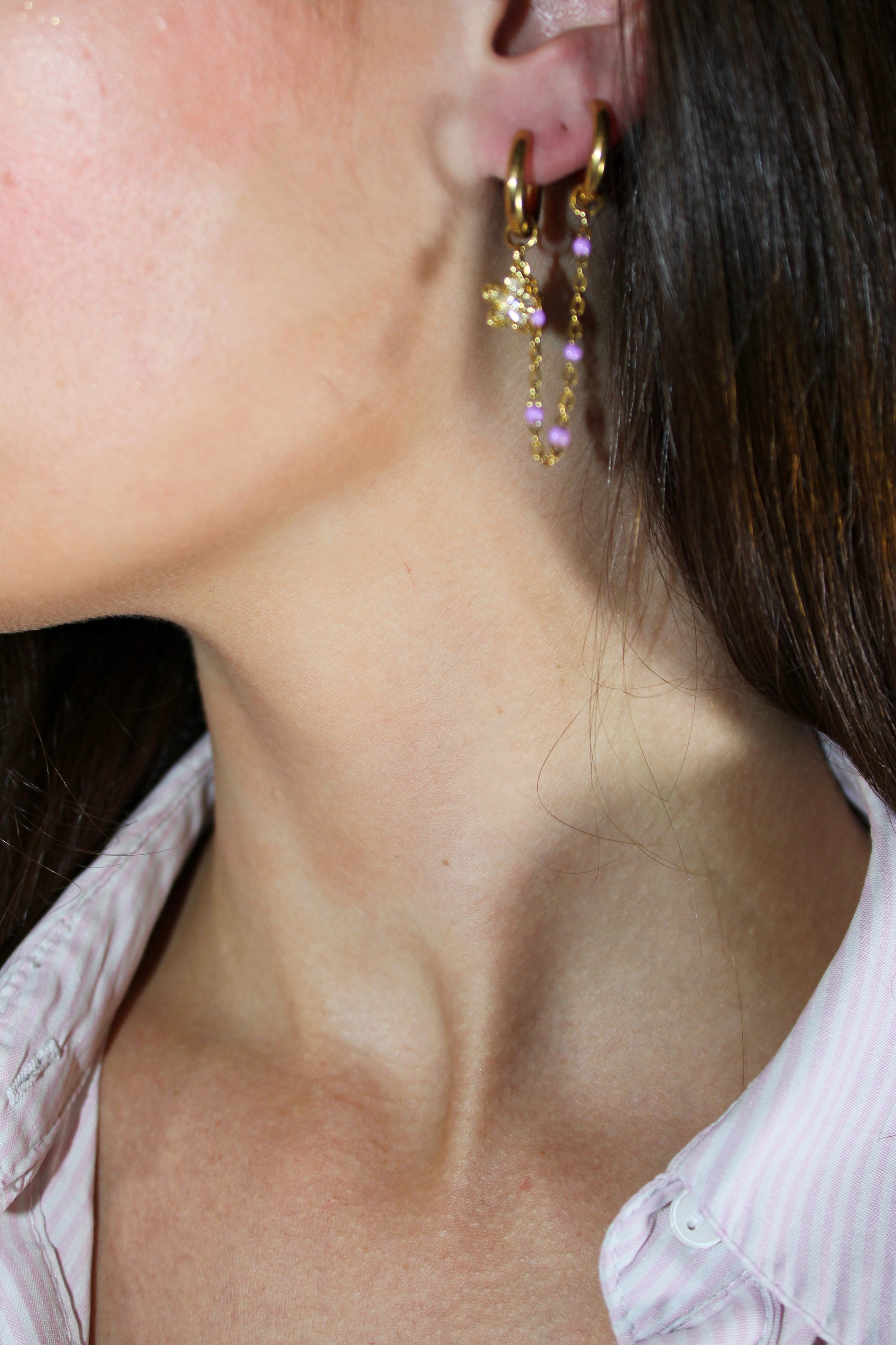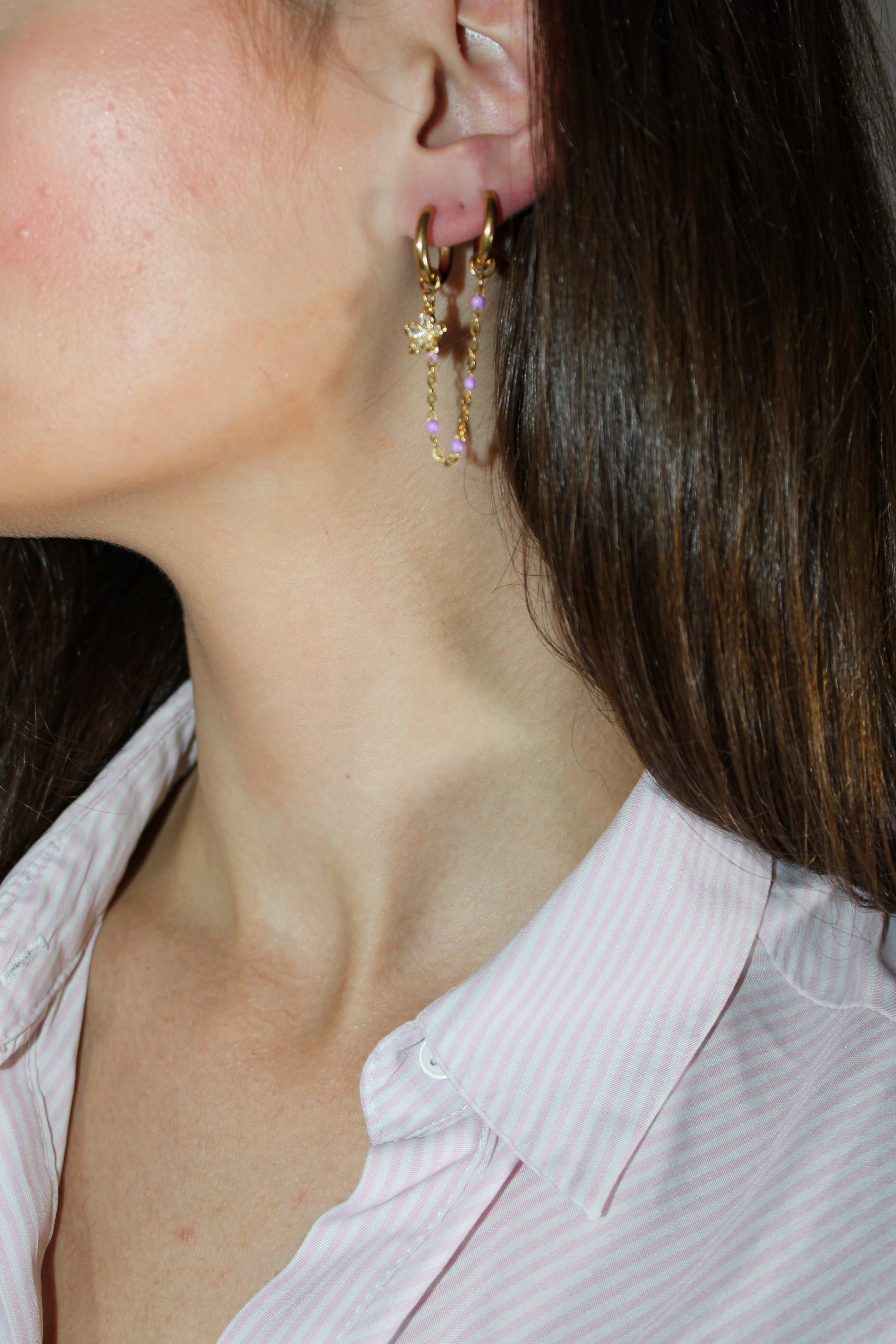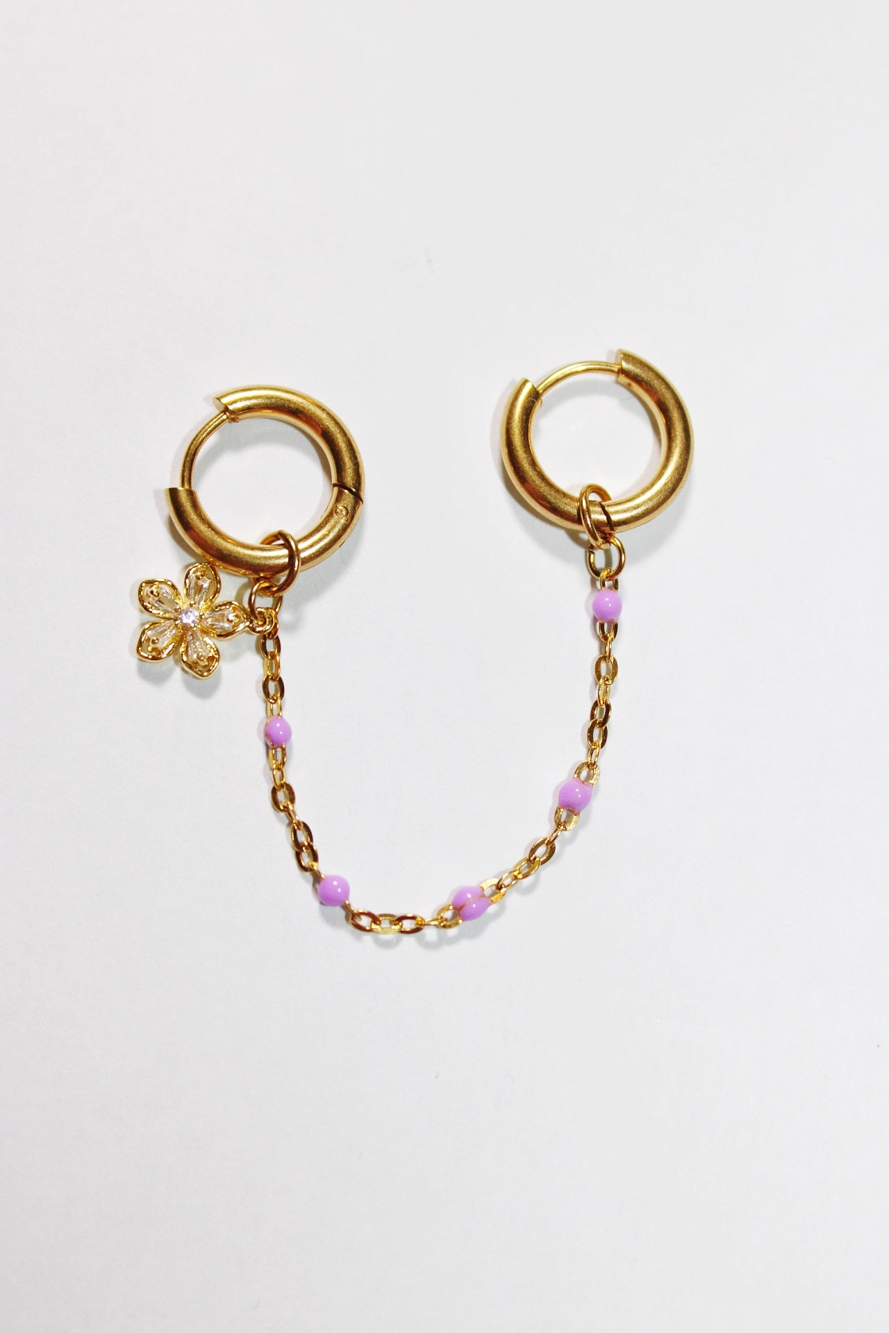 Ces boucles d'oreilles en acier inoxydable allient élégance et originalité. Leur design en chaînettes dorées est rehaussé de touches mauve , apportant une note dynamique et festive à votre look. Légères et confortables, elles se portent aussi bien au quotidien que lors d'occasions spéciales. Un bijou fantaisie parfait pour ajouter une touche de couleur et de modernité à votre style !