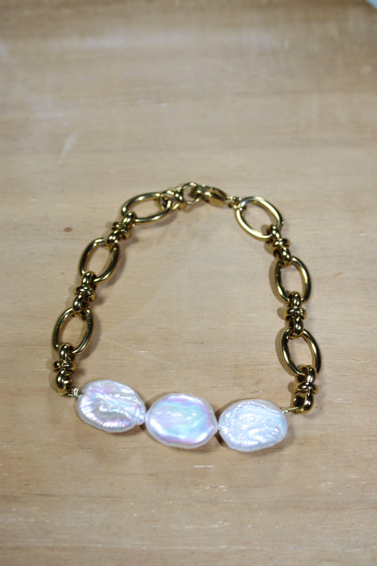 Laissez-vous séduire par ce bracelet délicat en chaîne acier inoxydable doré, sublimé par des perles d’eau douce nacrée. À la fois minimaliste et raffiné, ce bijou fantaisie élégant s’adapte à tous les styles et résiste parfaitement à l’eau et au temps. Une pièce intemporelle à porter seule ou en accumulation.