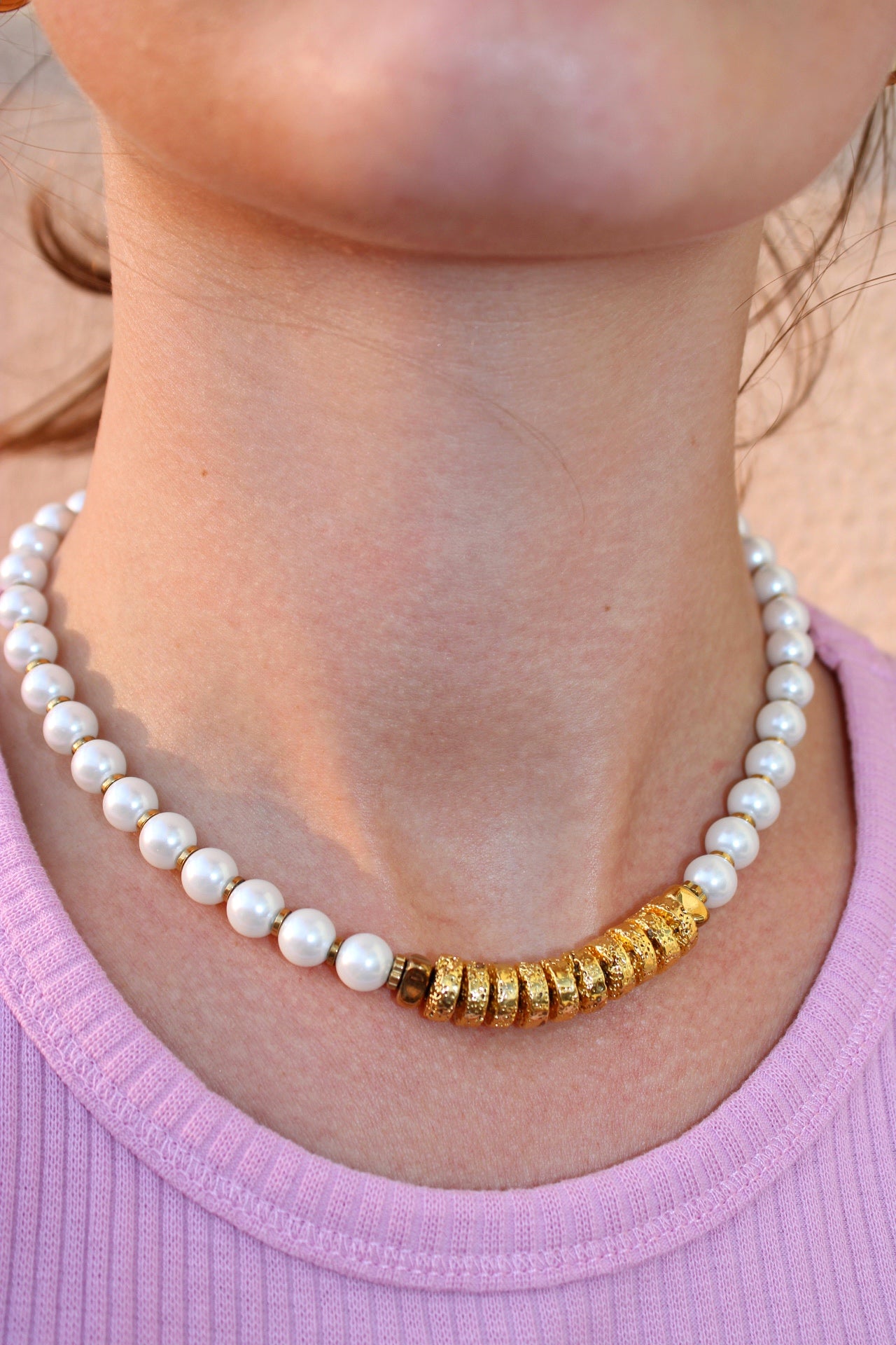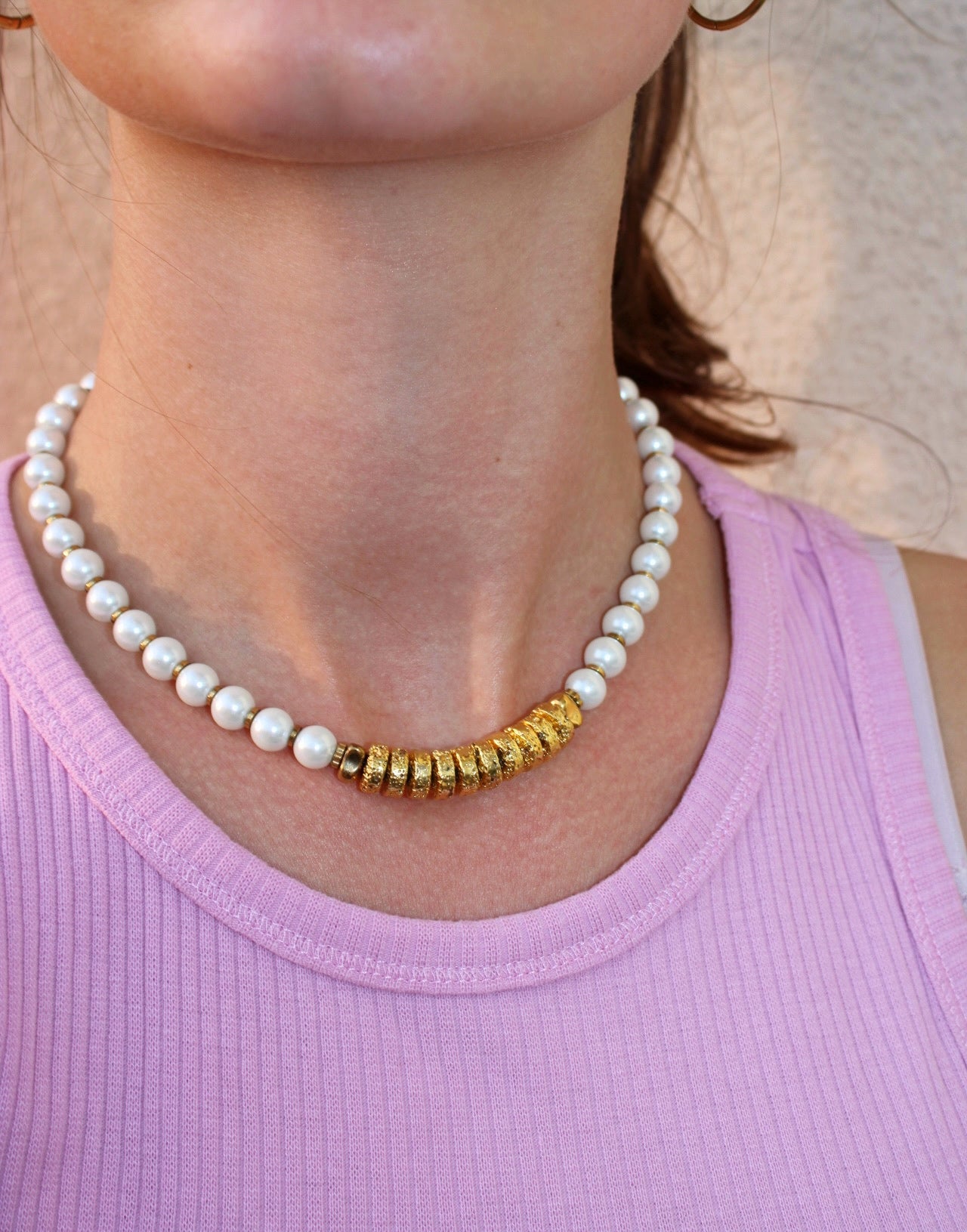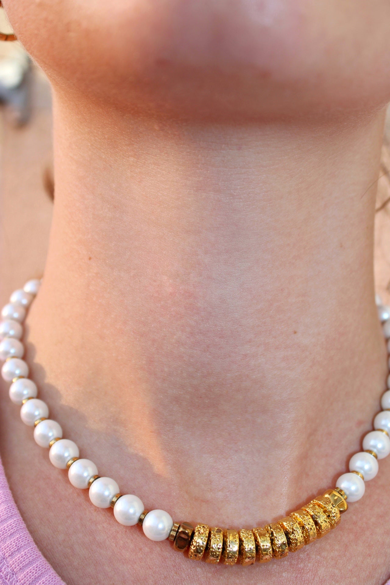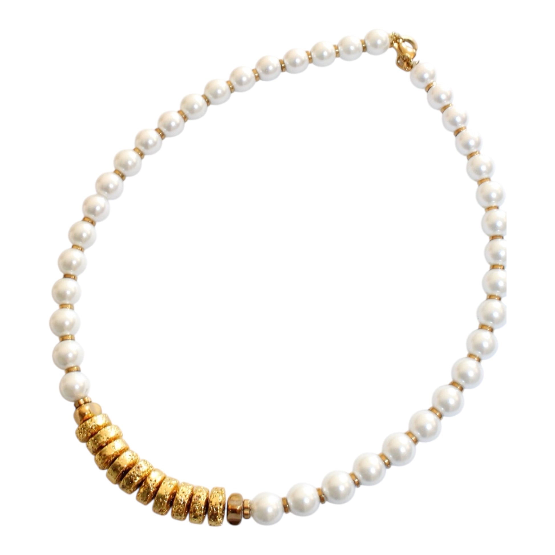 Collier fantaisie élégant composé de perles nacrées lumineuses associées à de délicates hématites dorées pour une touche chic et moderne. Ce collier en perles nacrées se distingue par son style raffiné, parfait pour apporter de l’éclat et de la féminité à toutes les tenues. Léger, tendance et facile à porter, il est idéal pour les amatrices de bijoux fantaisie, d’accessoires dorés et de créations artisanales. Un collier perles nacrées et hématite dorée indispensable pour compléter un look élégant ou offrir en cadeau.