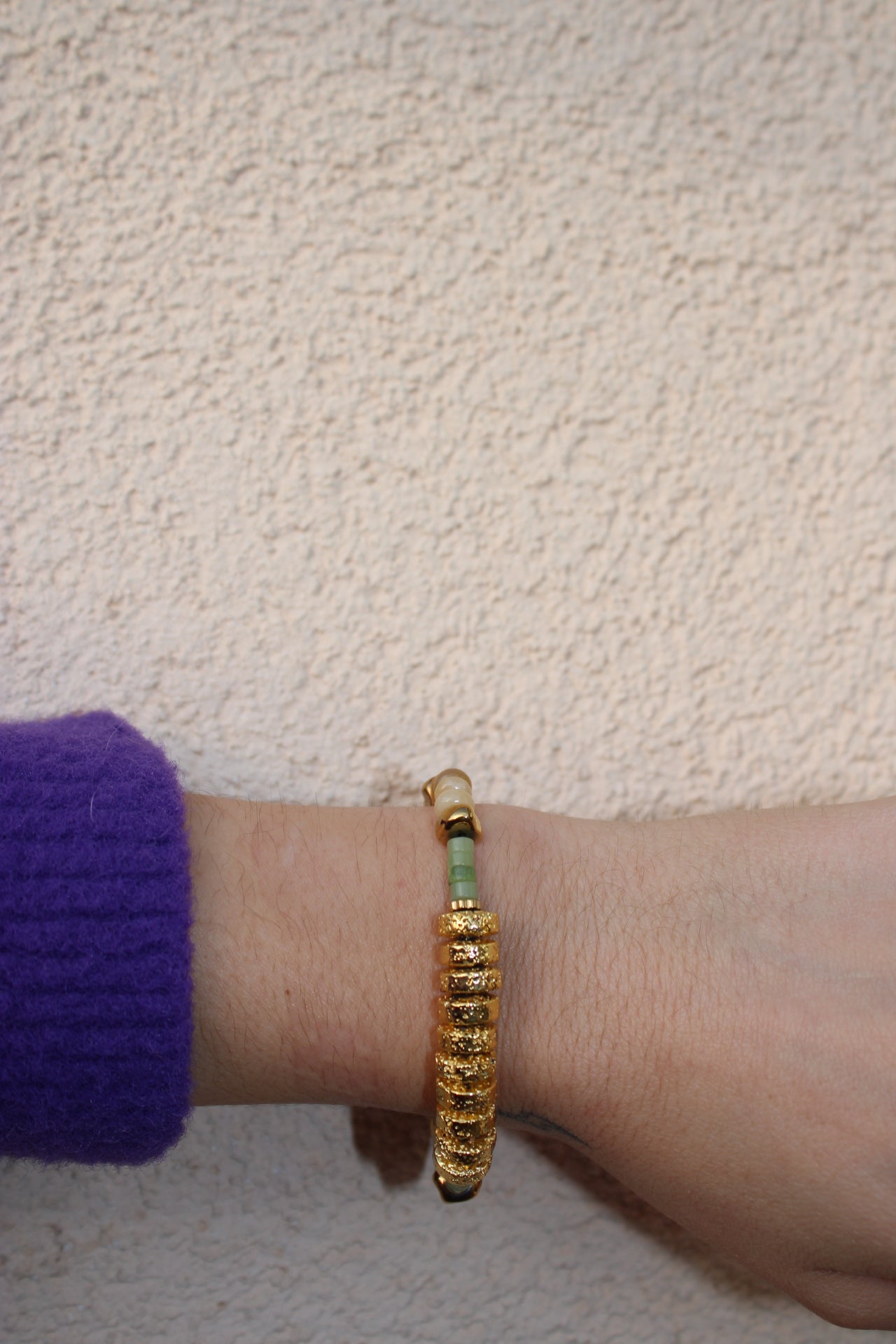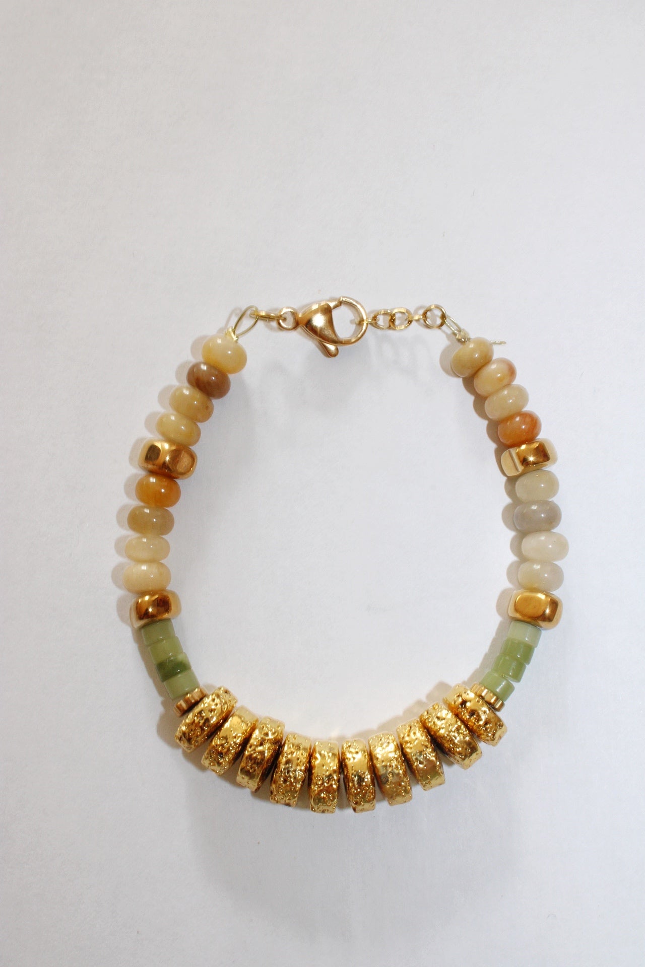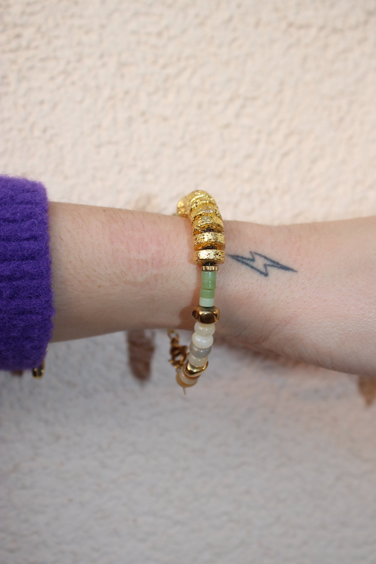 Bracelet fantaisie en perles heishi colorées, sublimé par de délicates perles en hématite dorée pour une touche lumineuse et moderne. Ce bracelet bohème au style vibrant et tendance apporte une note estivale et joyeuse à toutes les tenues. Léger, confortable et plein de charme, il est idéal comme bijou fantaisie, bracelet coloré, ou accessoire bohèmepour femme. Un bracelet heishi unique, parfait pour un look décontracté, chic et ensoleillé.