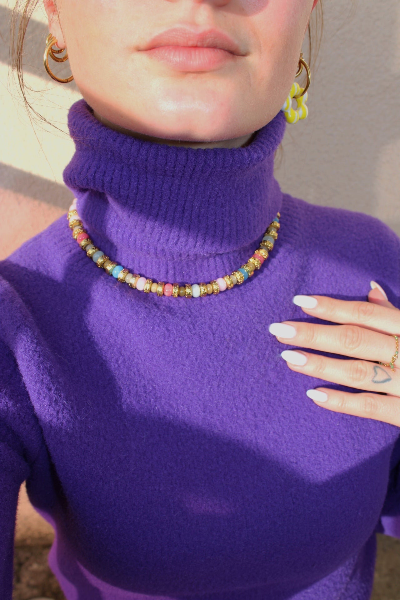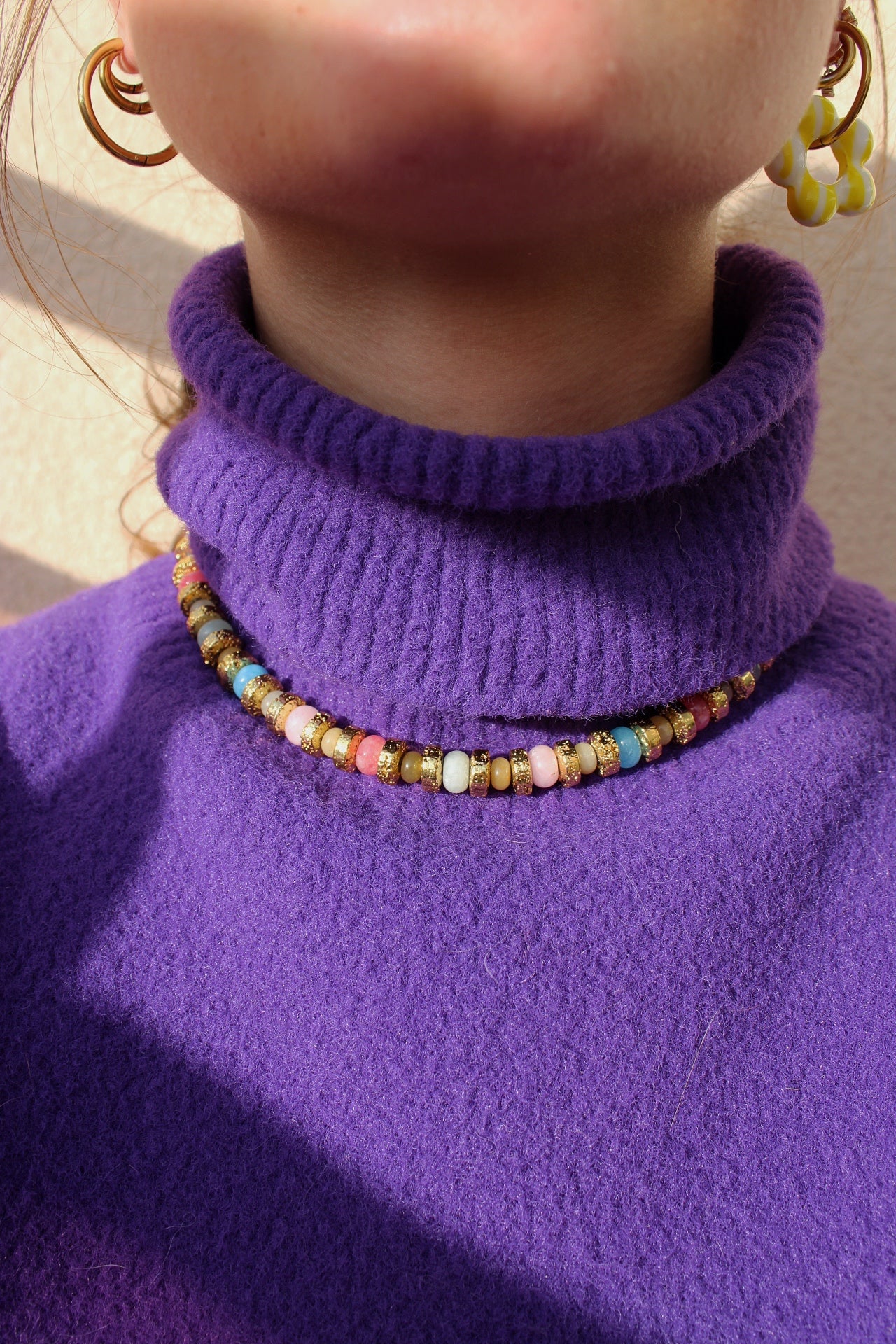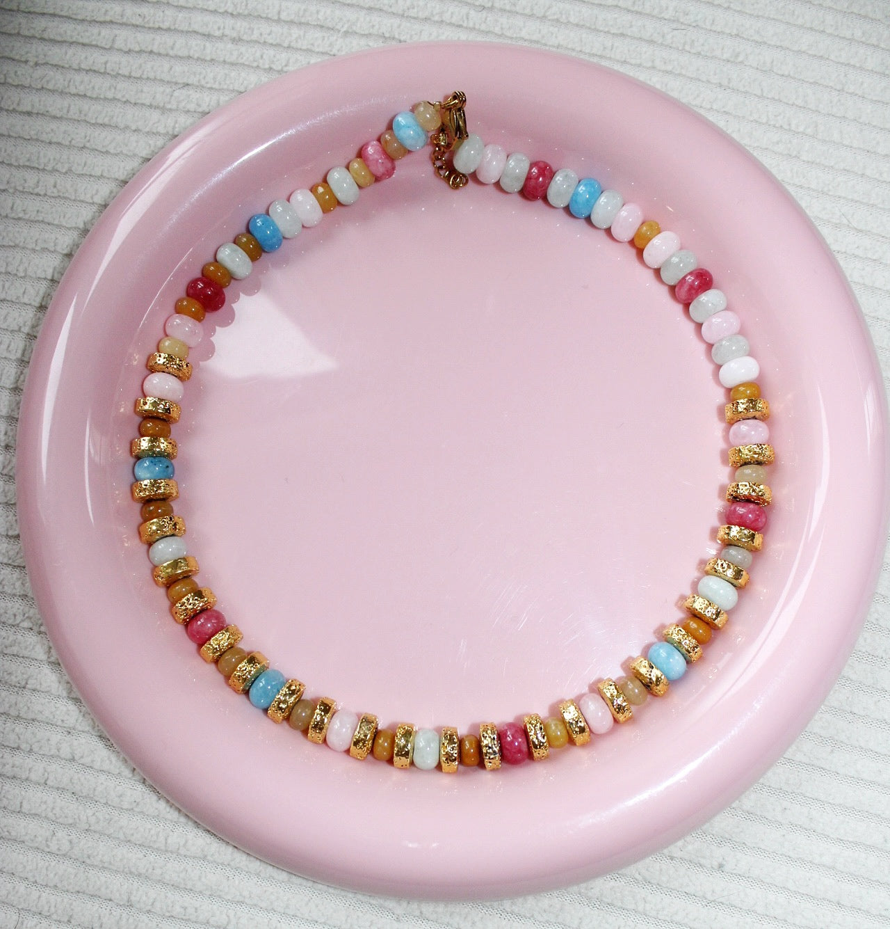 Collier fantaisie délicat composé de perles de pierres naturelles : morganite, angélite et aigue-marine en rondelles, offrant une palette de couleurs douces et apaisantes. Ce collier en pierres naturelles séduit par son style féminin et lumineux, parfait pour ajouter une touche élégante et raffinée à toutes les tenues. Chaque perle met en valeur la beauté authentique des minéraux, créant un bijou fantaisie unique, tendance et idéal pour les amatrices d’accessoires artisanaux. Un collier morganite angélite aigue-marine plein de charme, parfait pour offrir ou compléter une collection de bijoux en pierres naturelles.