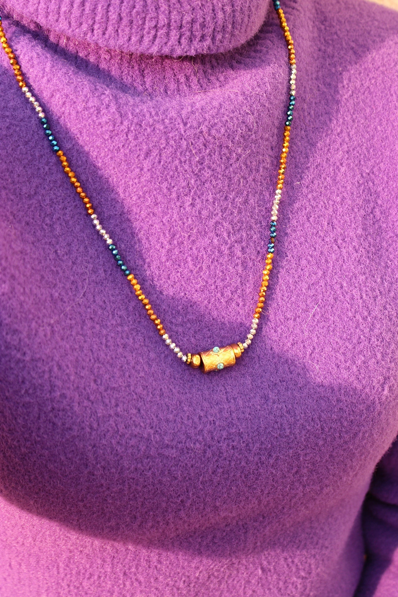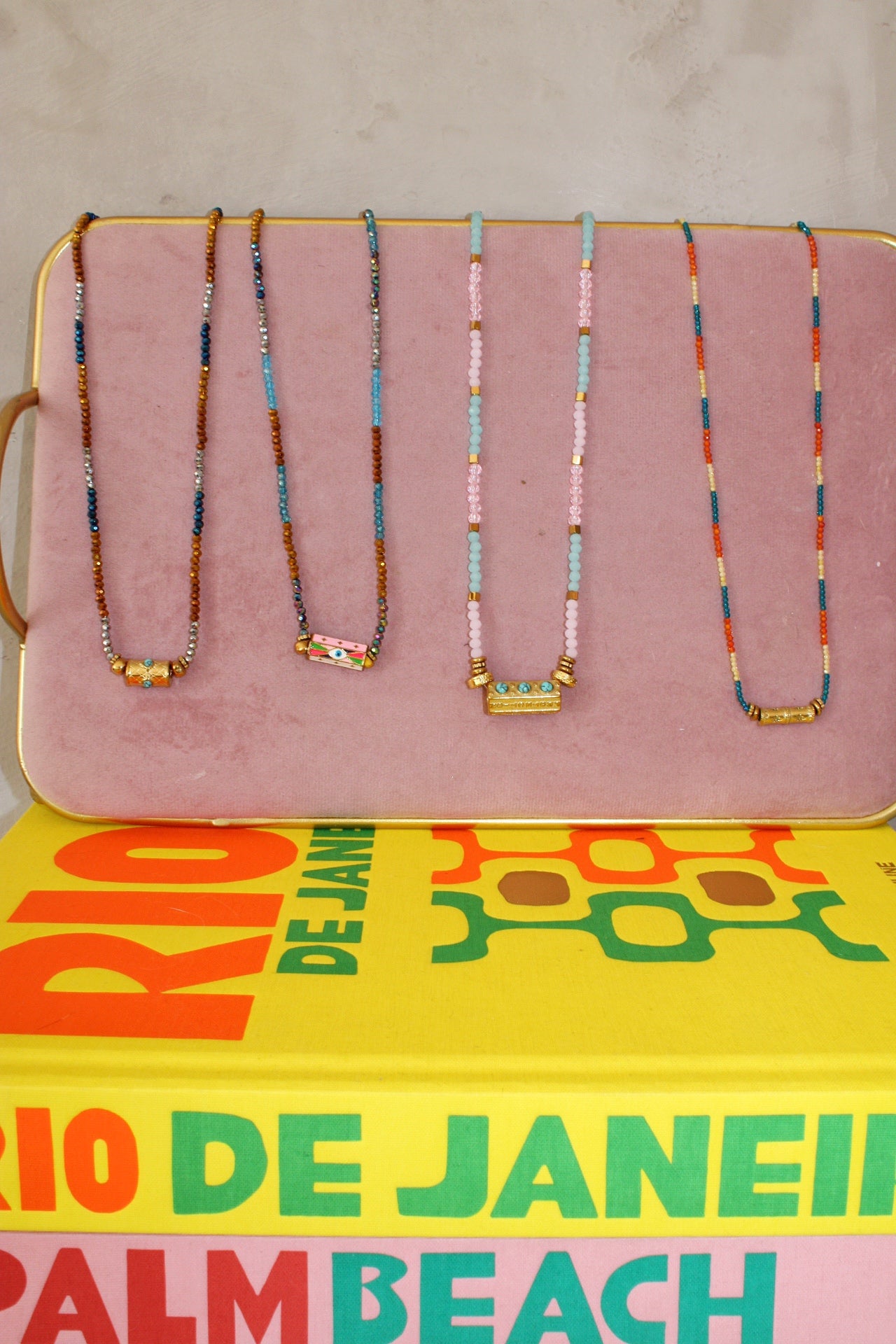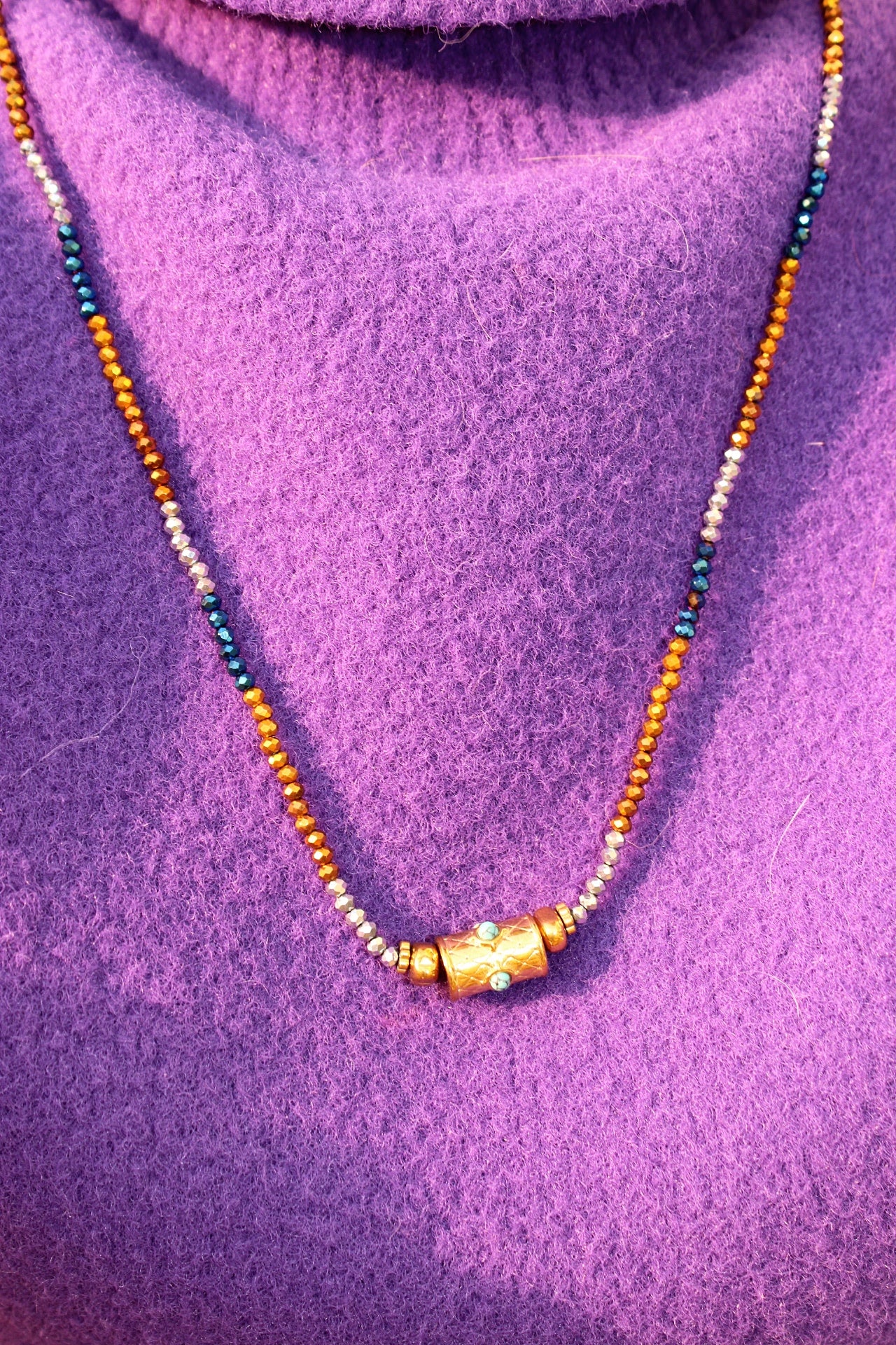 Apportez une touche originale et coloré à votre look avec ce collier sautoir fantaisieen petites perles de verres. Orné d'un jonc en laiton doré ce bijou évoque l’esprit bohème chic. Léger et facile à porter, ce collier long sublimera vos tenues festives comme vos looks décontractés du quotidien. Idéal pour les amatrices de bijoux artisanaux, il mêle avec finesse couleurs vibrantes et détails bohèmes.