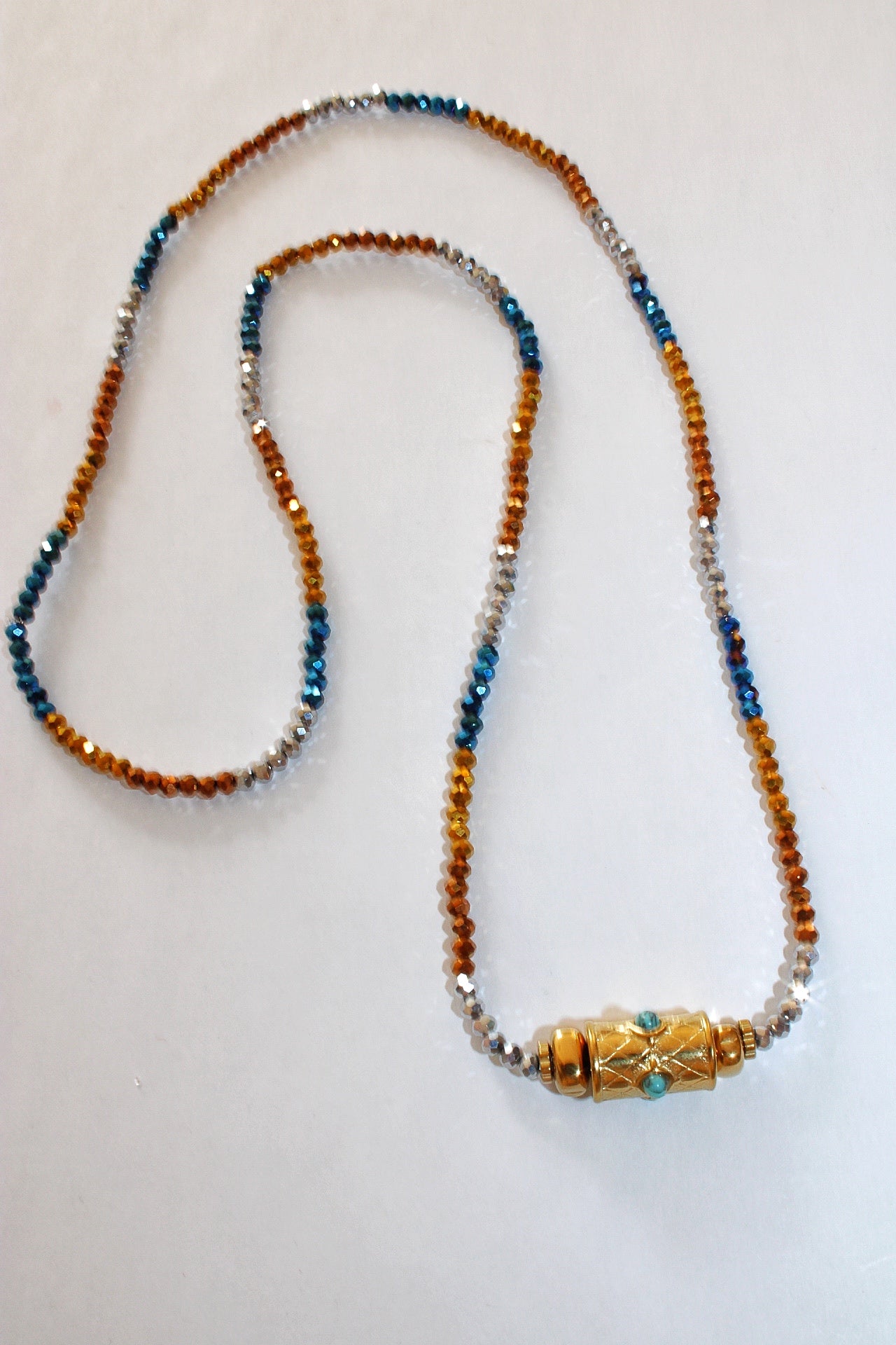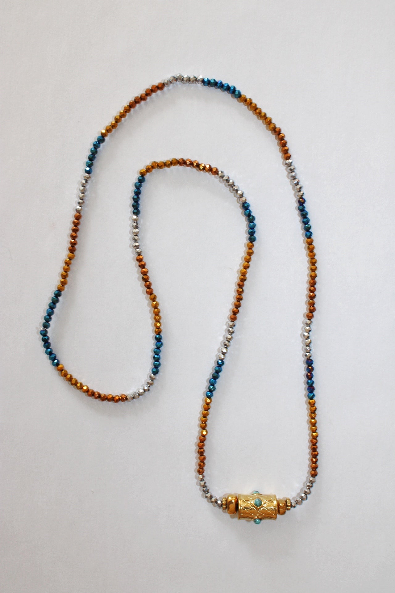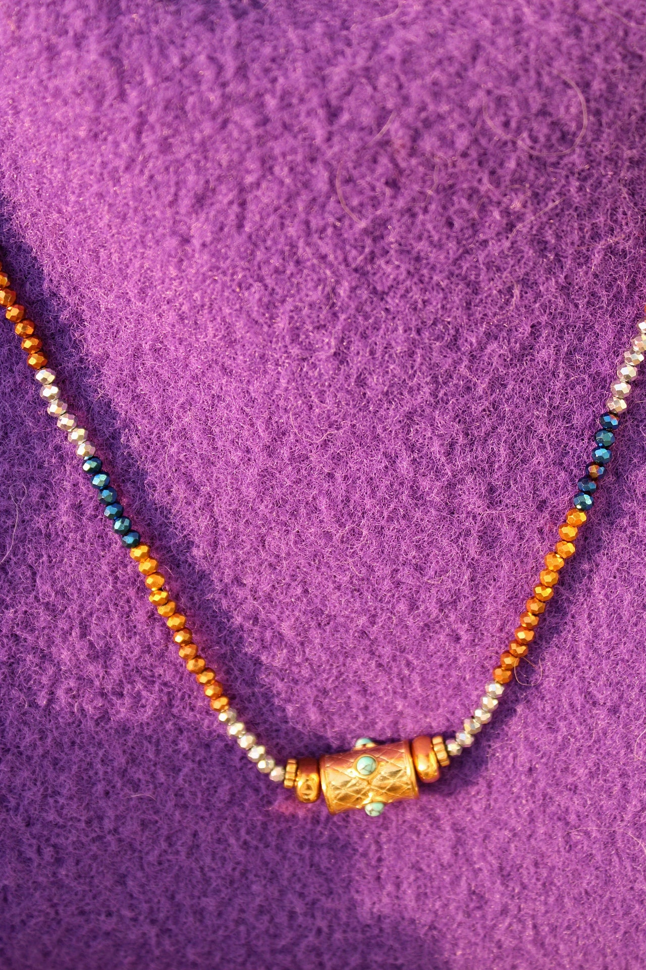 Apportez une touche originale et coloré à votre look avec ce collier sautoir fantaisieen petites perles de verres. Orné d'un jonc en laiton doré ce bijou évoque l’esprit bohème chic. Léger et facile à porter, ce collier long sublimera vos tenues festives comme vos looks décontractés du quotidien. Idéal pour les amatrices de bijoux artisanaux, il mêle avec finesse couleurs vibrantes et détails bohèmes.