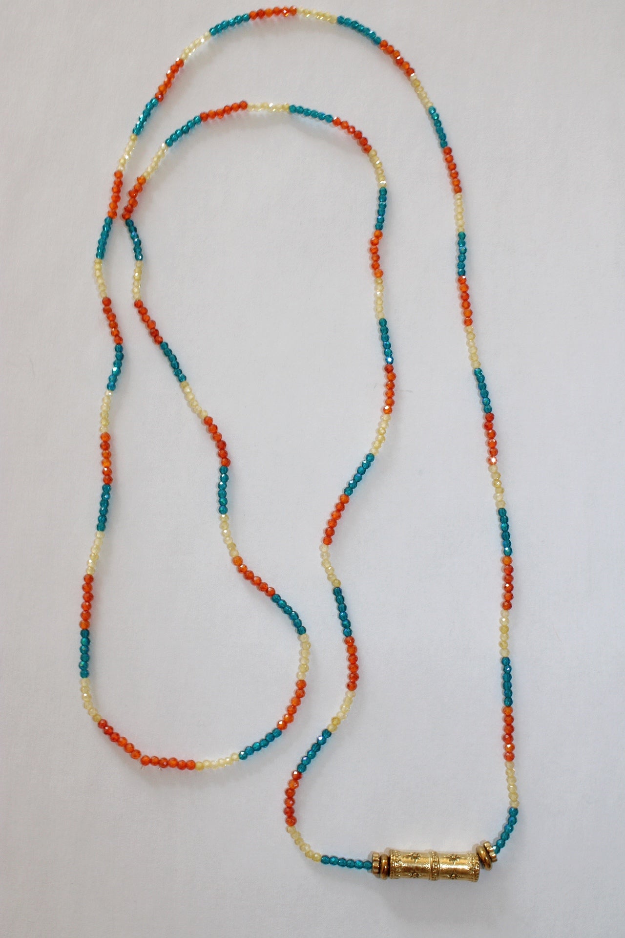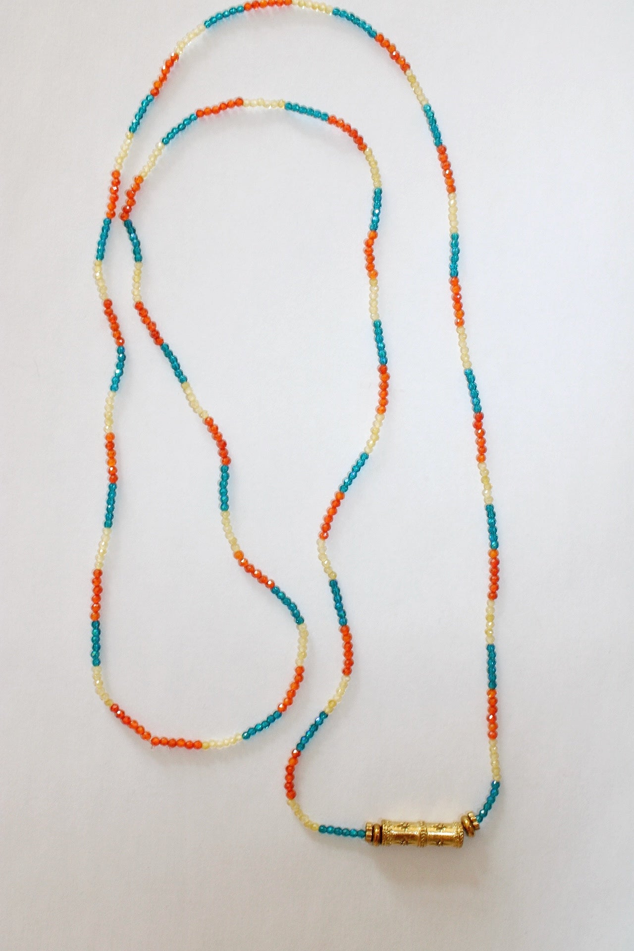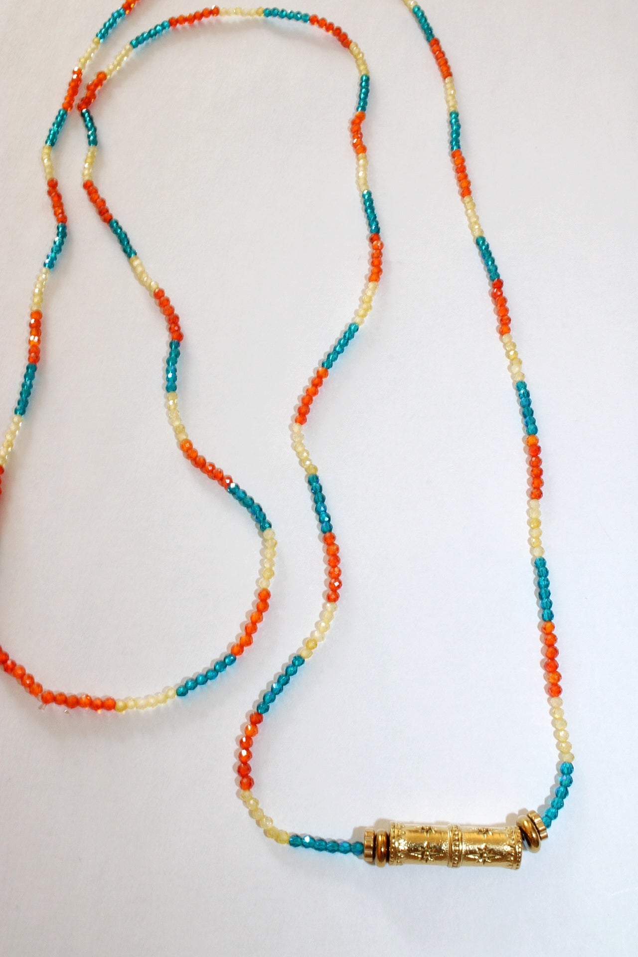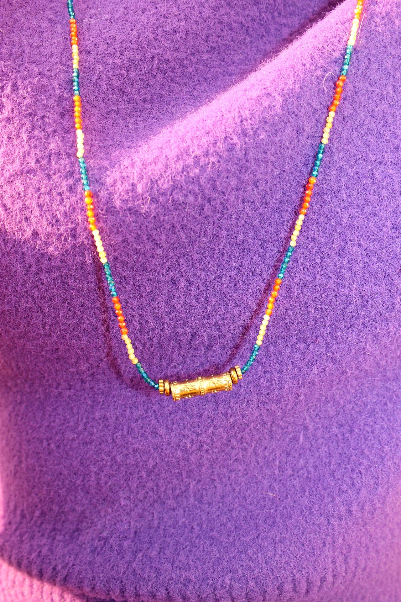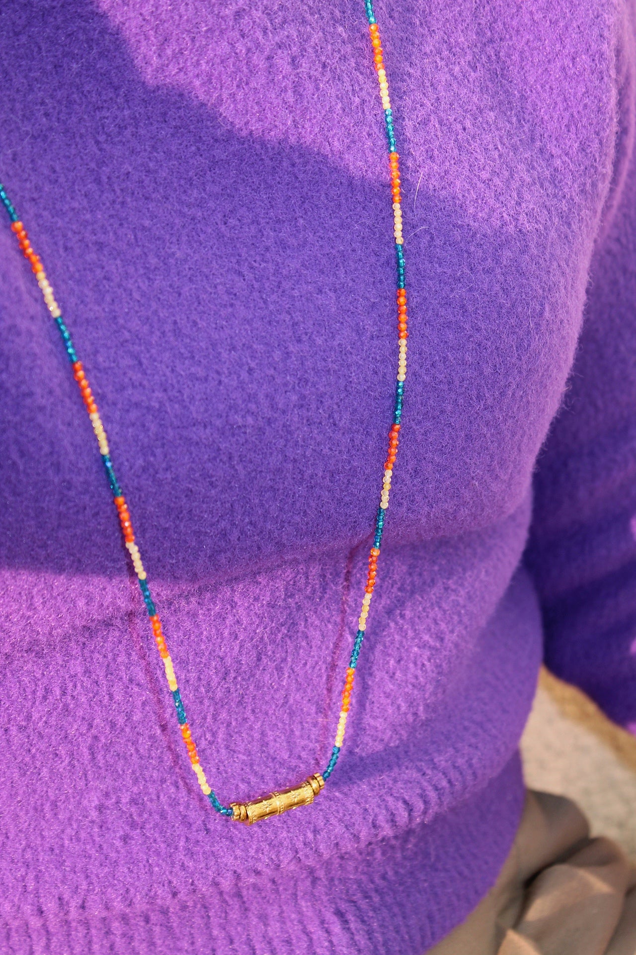 Apportez une touche originale et coloré à votre look avec ce collier sautoir fantaisieen petites perles de verres. Orné d'un jonc en laiton doré ce bijou évoque l’esprit bohème chic. Léger et facile à porter, ce collier long sublimera vos tenues festives comme vos looks décontractés du quotidien. Idéal pour les amatrices de bijoux artisanaux, il mêle avec finesse couleurs vibrantes et détails bohèmes.