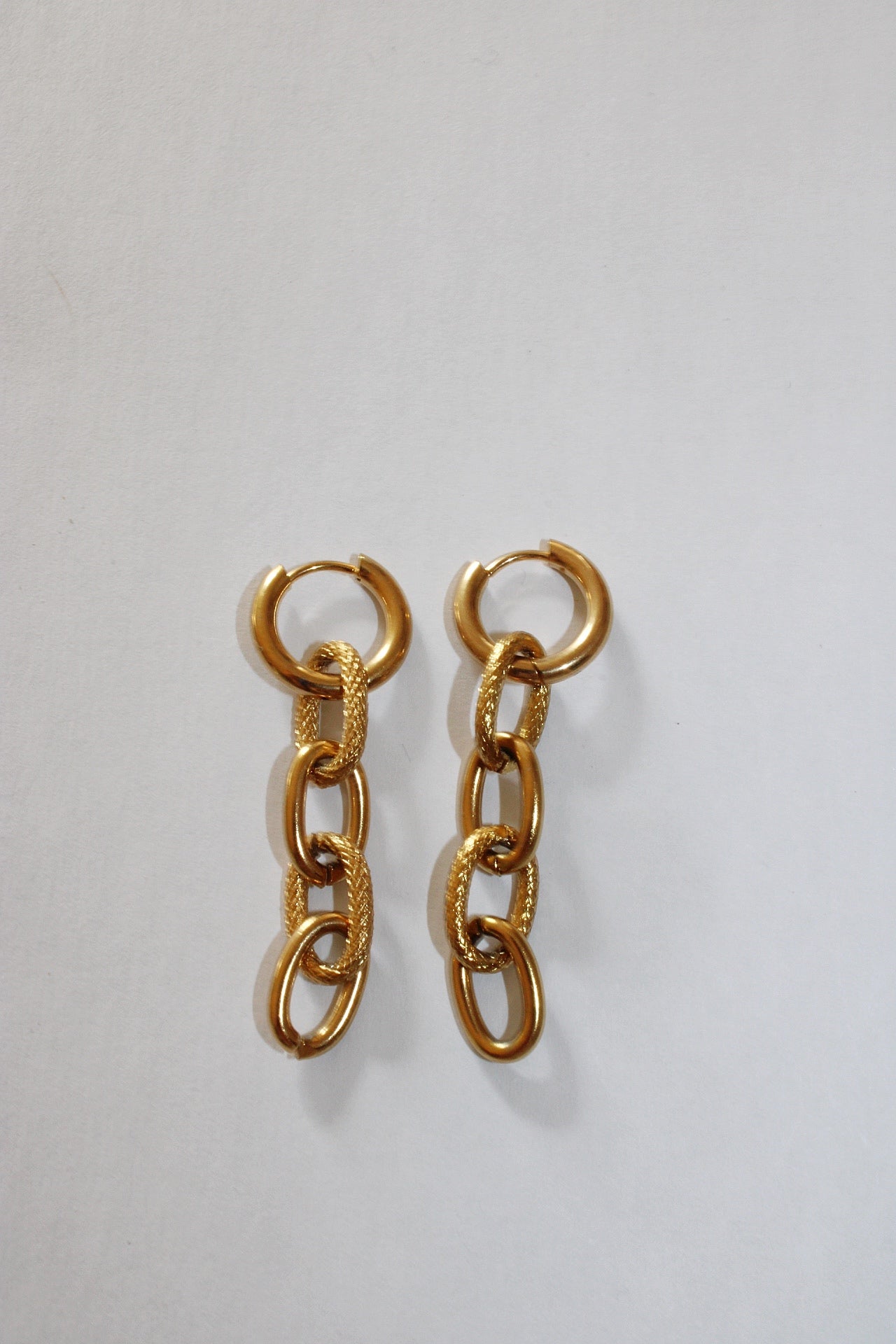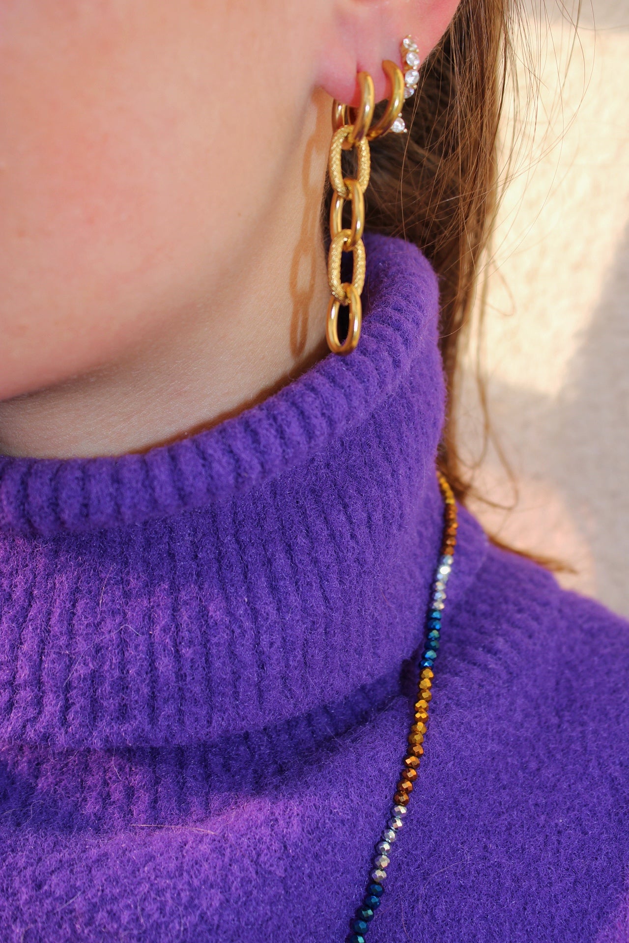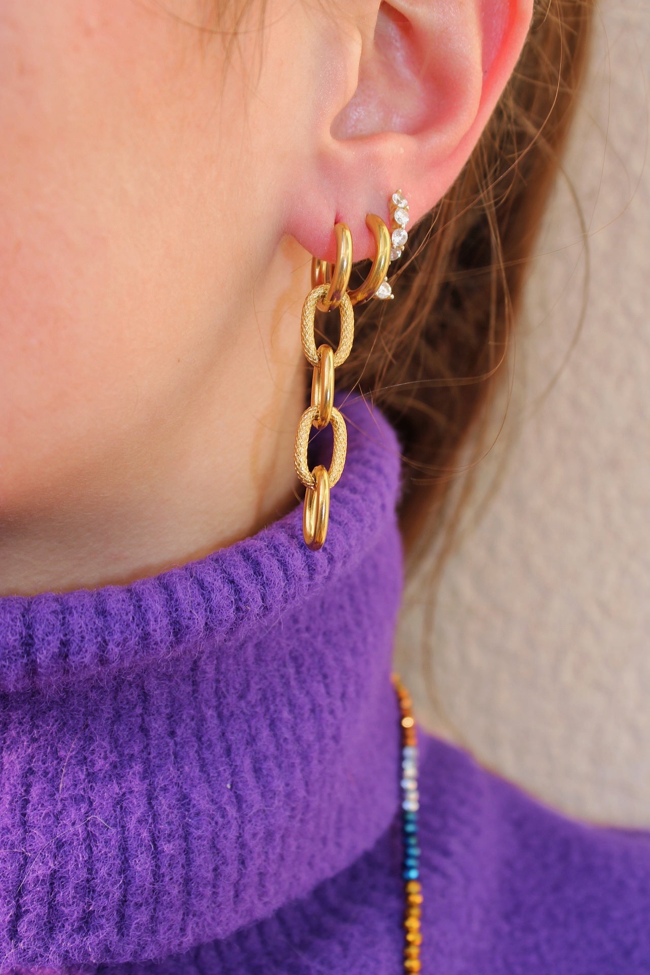Ces boucles d'oreilles créoles en acier inoxydable doré allient élégance et légèreté. Leur design raffiné met en valeur une chaînette en acier inoxydable délicatement suspendus par un strass au centre de chaque créole, apportant une touche de féminité et de liberté. La finition dorée brillante offre une allure moderne et sophistiquée, parfaite pour sublimer toutes vos tenues, que ce soit au quotidien ou pour des occasions spéciales. Résistantes et intemporelles, ces boucles d'oreilles sont un accessoire essentiel pour un look chic et original.