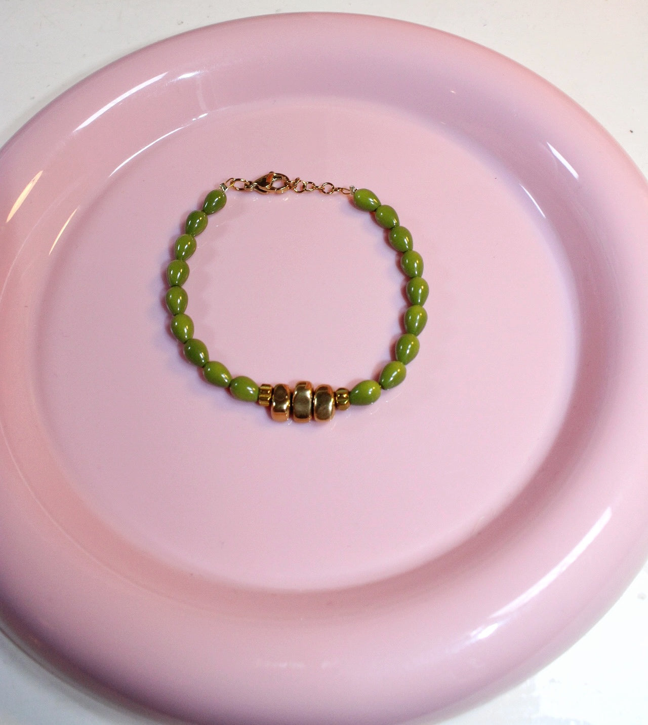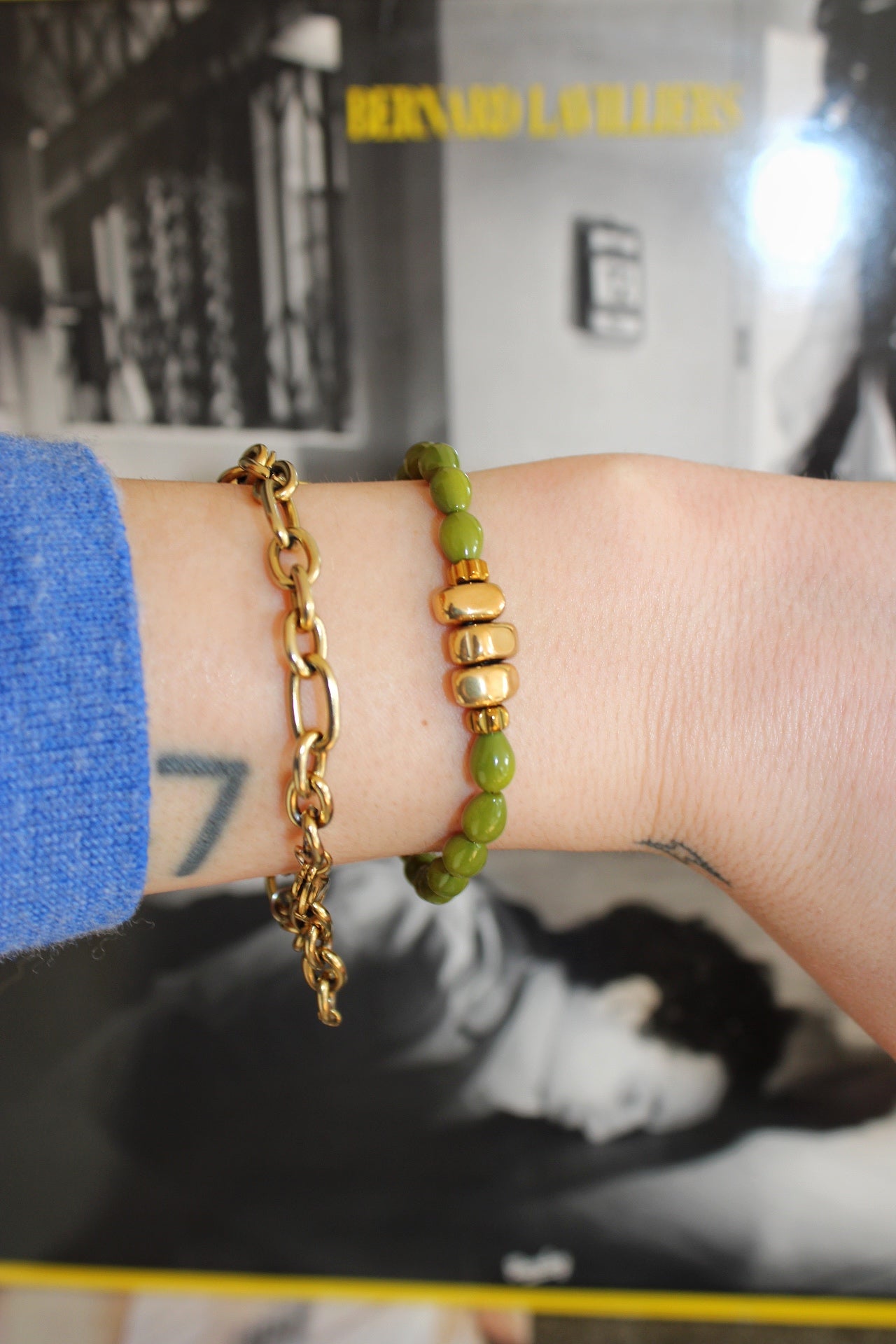 Ce bracelet délicat est composé de perles gouttes d’eau effet olive verte, aux reflets subtils et lumineux. Leur forme fluide et leur teinte verte olive apportent une touche naturelle, raffinée et apaisante au poignet. Inspiré par la nature et la douceur végétale, ce bijou incarne l’élégance discrète et le charme intemporel.