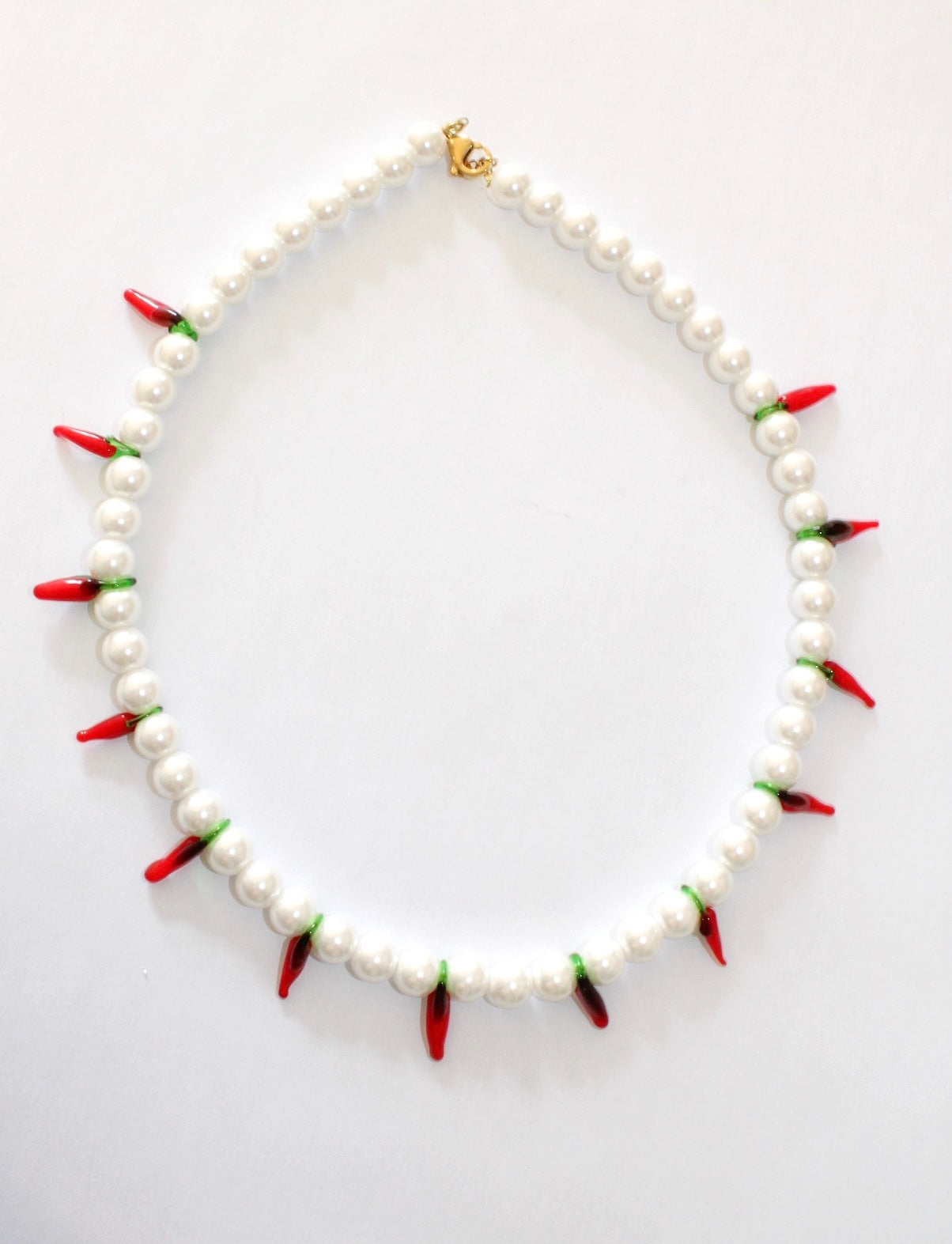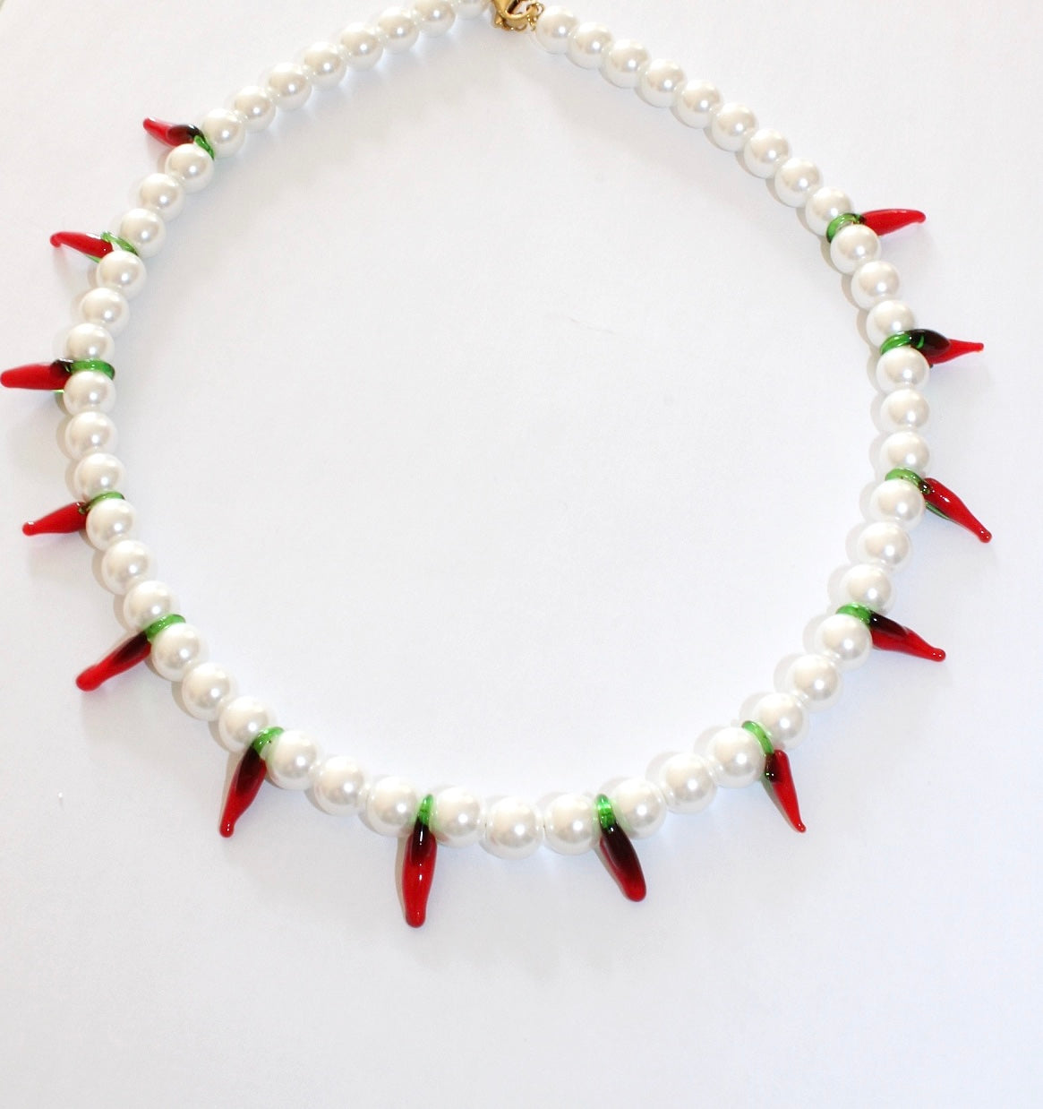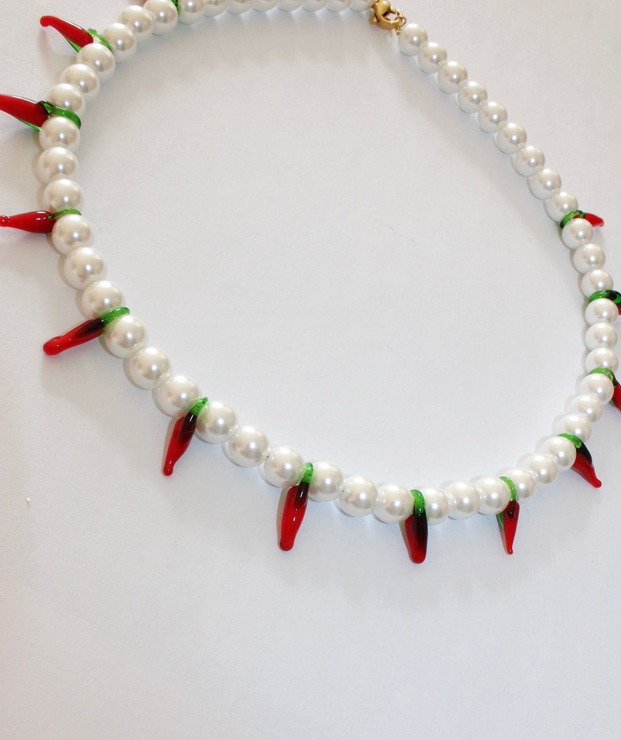 Collier fantaisie original composé de perles nacrées lumineuses, rehaussé de petits piments en verre rouges pour une touche amusante et tendance. Ce collier en perles nacrées mêle élégance et originalité, idéal pour apporter du caractère à n’importe quelle tenue. Léger et moderne, il convient parfaitement aux amatrices de bijoux fantaisie, d’accessoires colorés et de créations artisanales uniques. Un collier piments en verre plein de charme, parfait pour offrir ou enrichir une collection de bijoux faits main.