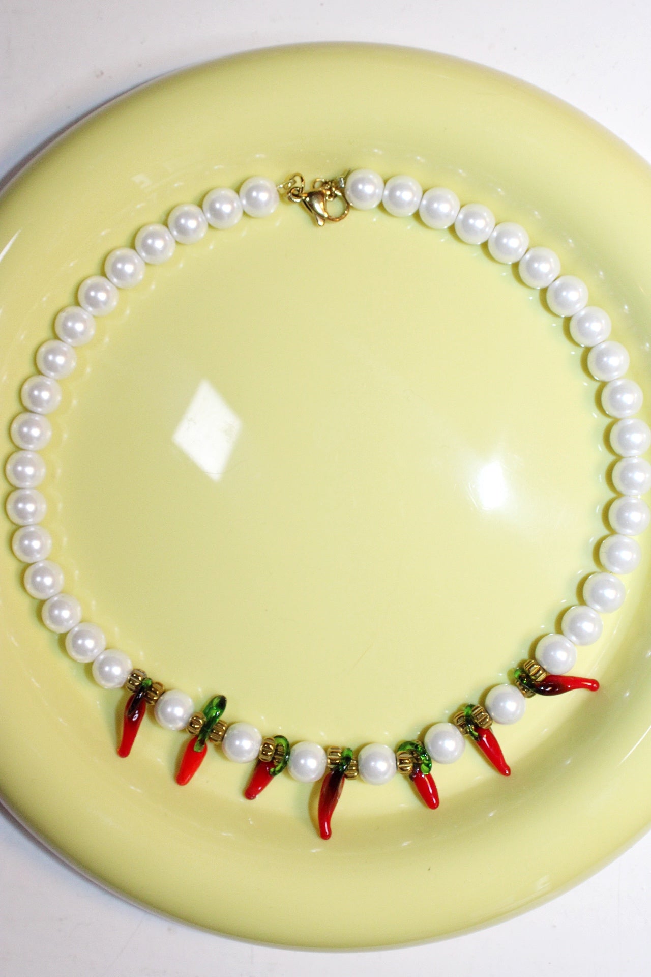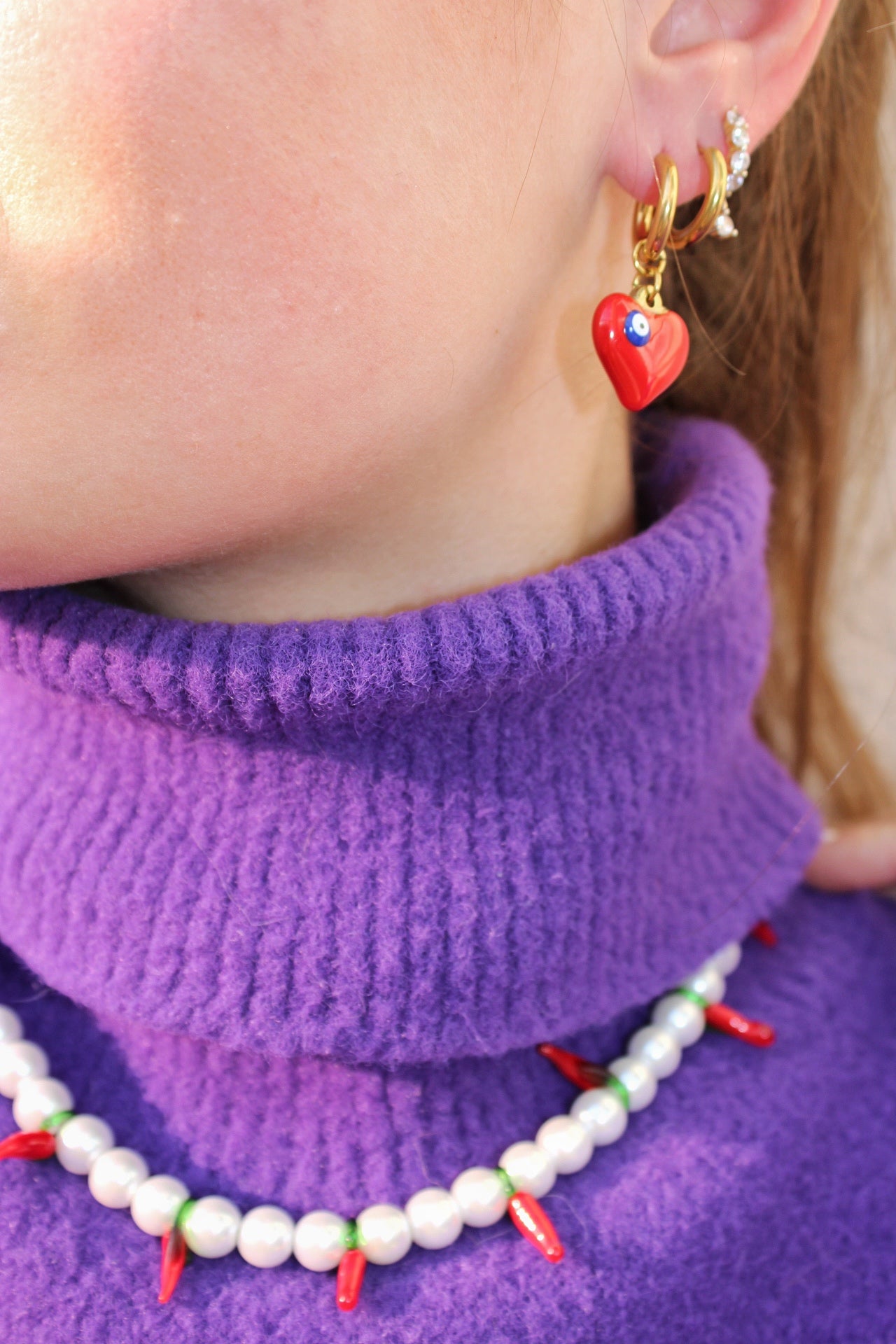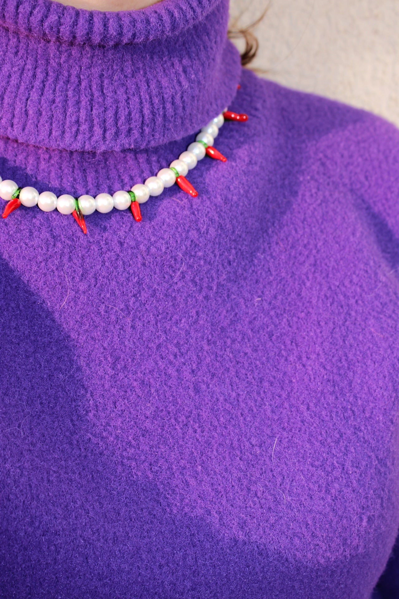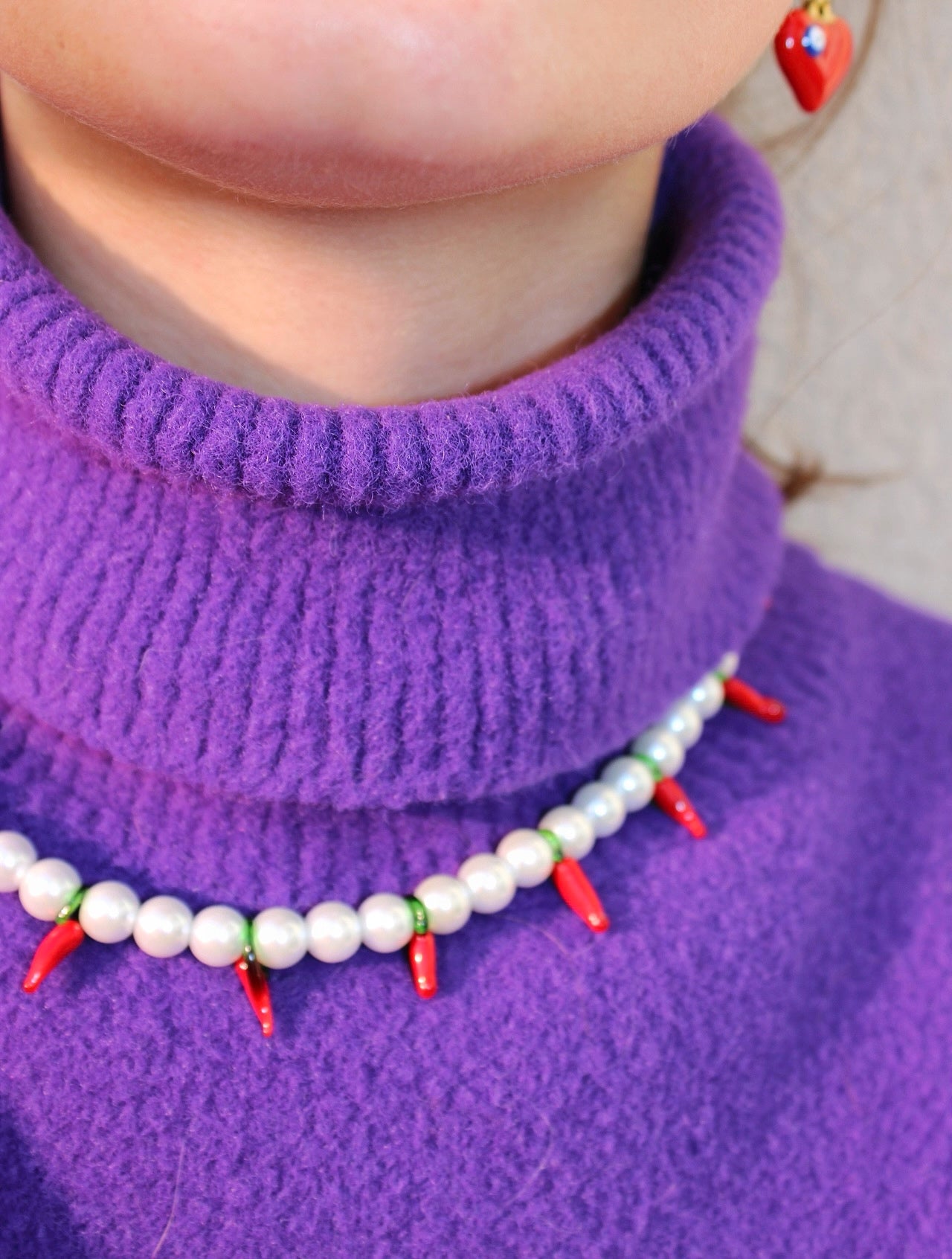 Collier fantaisie original composé de perles nacrées lumineuses, rehaussé de petits piments en verre rouges pour une touche amusante et tendance. Ce collier en perles nacrées mêle élégance et originalité, idéal pour apporter du caractère à n’importe quelle tenue. Léger et moderne, il convient parfaitement aux amatrices de bijoux fantaisie, d’accessoires colorés et de créations artisanales uniques. Un collier piments en verre plein de charme, parfait pour offrir ou enrichir une collection de bijoux faits main.
