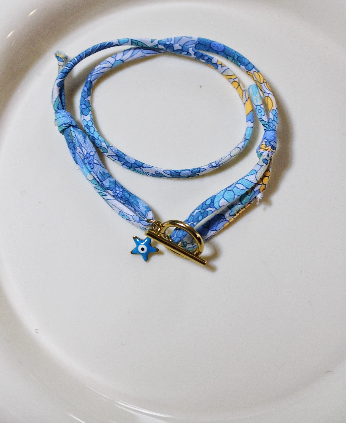 Réalisé à la main avec un ruban Liberty aux motifs floraux emblématiques, chaque bracelet est unique et apporte une touche de poésie à votre poignet.