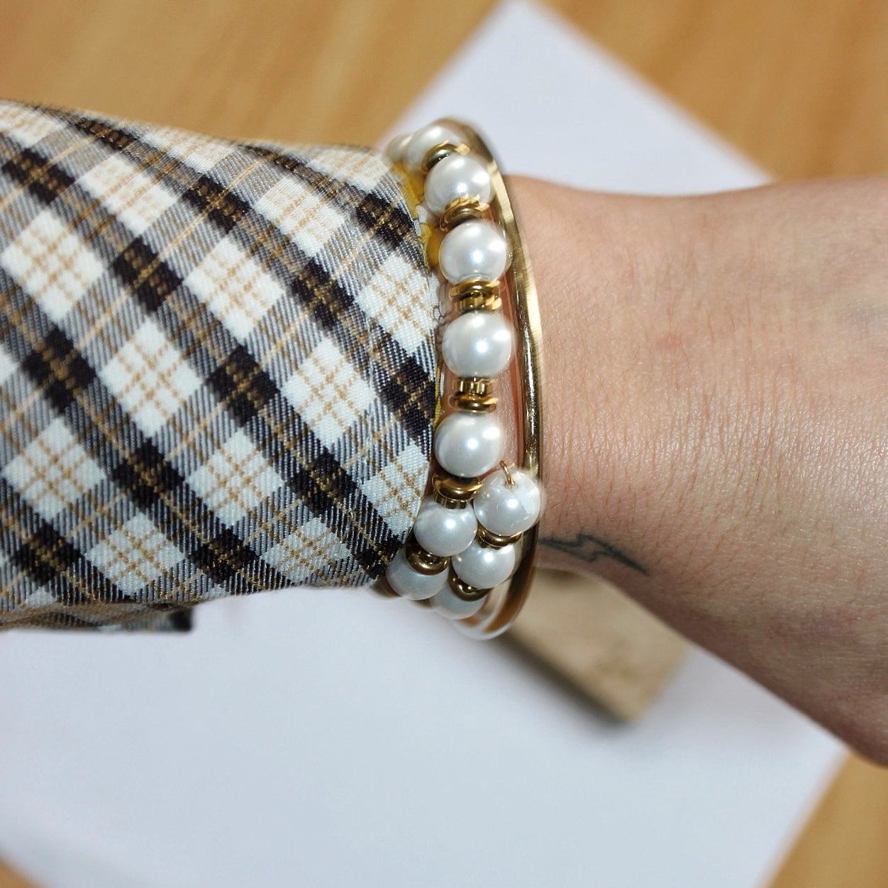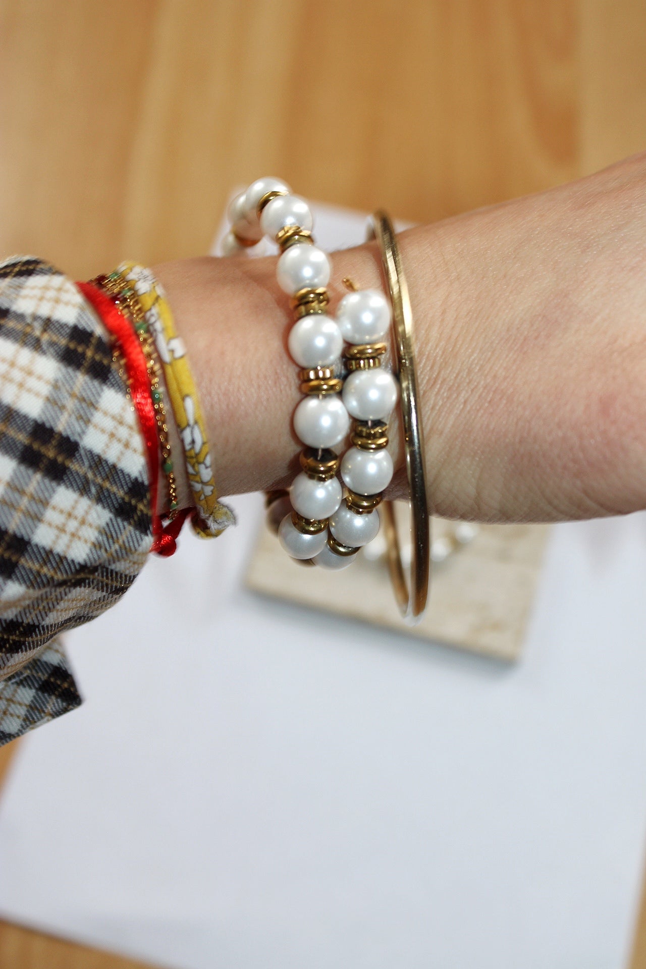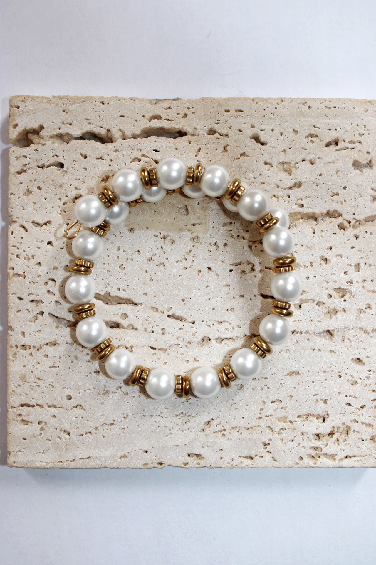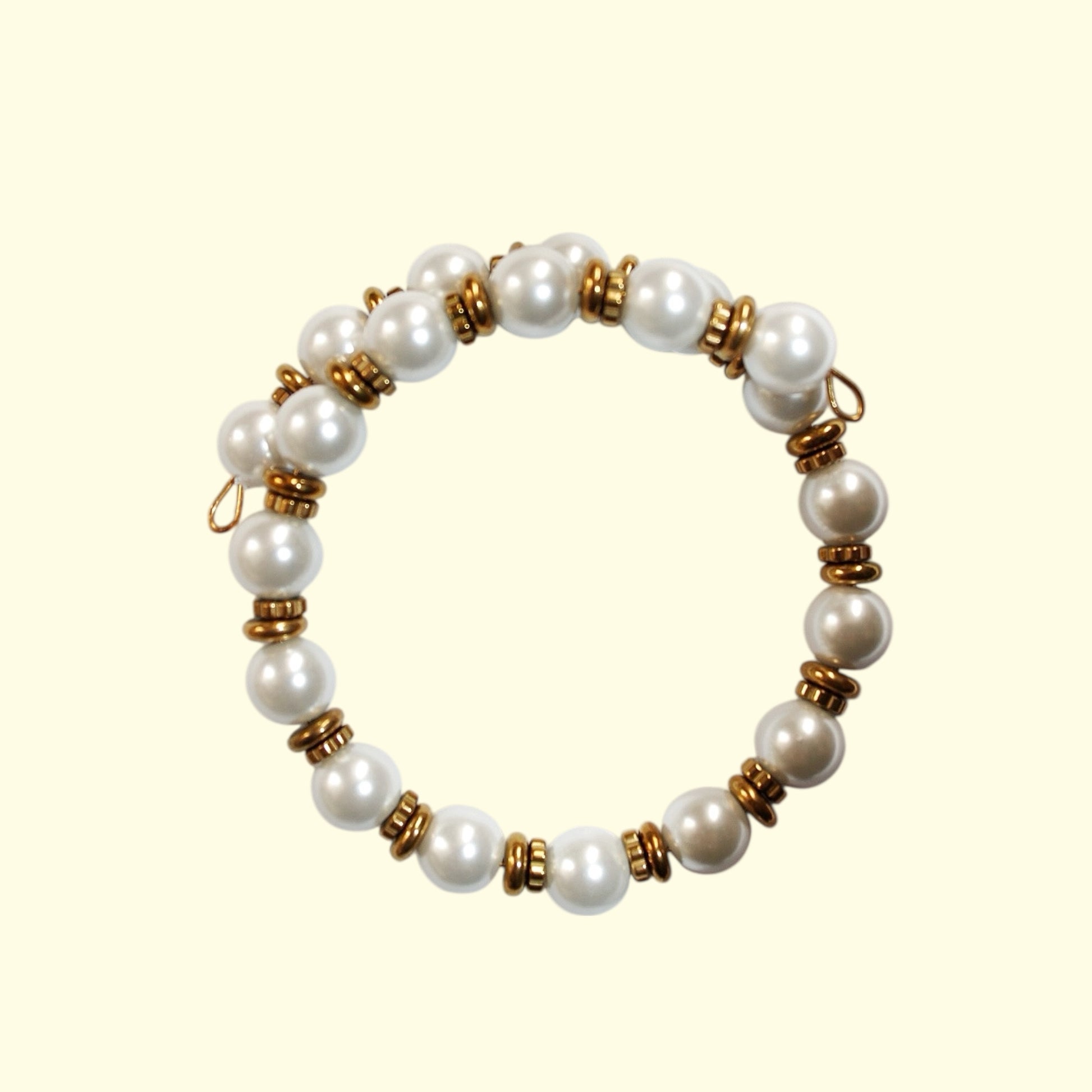 Bracelet fantaisie élégant composé de perles nacrées lumineuses et de perles d’hématite dorée, monté sur un fil mémoire en laiton doré pour une tenue parfaite au poignet. Ce bracelet en perles nacrées allie raffinement et modernité, offrant un style chic et féminin. Sa structure en fil mémoire assure confort, solidité et facilité d’enfilage, idéal pour un usage quotidien. Un bracelet fantaisie doré intemporel, parfait comme bijou artisanal, accessoire mode ou idée cadeau tendance.