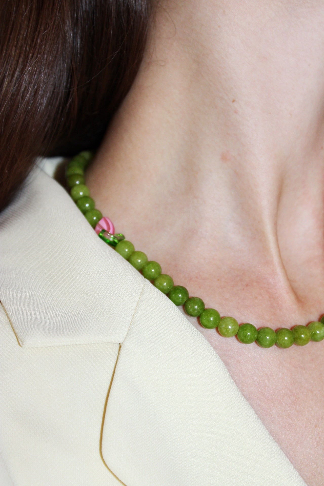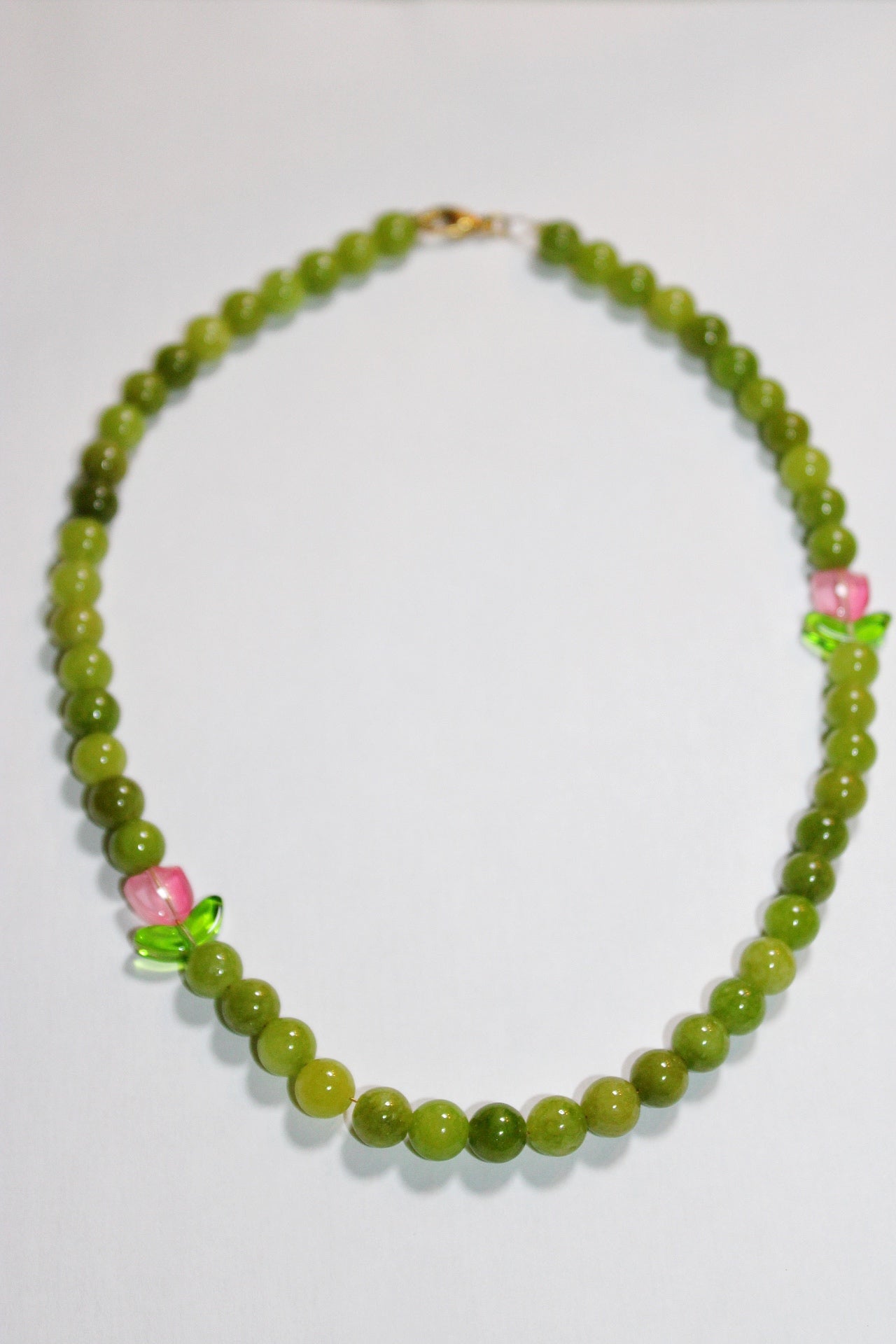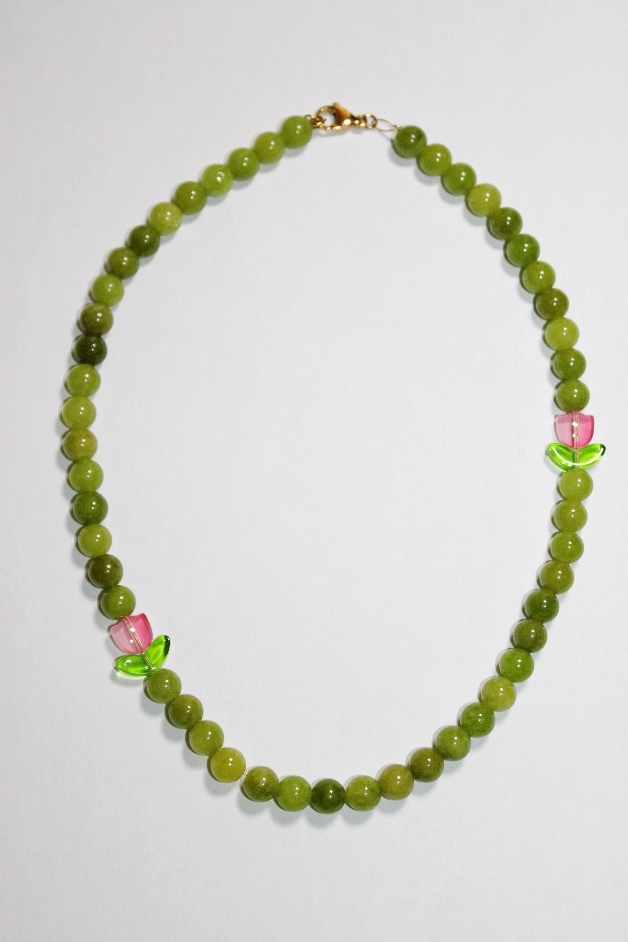 Collier en perles rondes vertes et charms tulipes, confectionné à la main avec soin dans un atelier de création de bijoux. Ce bijou élégant et intemporel combine la sobriété des perles vertes de péridot, et l'originalité du piment en verre, apportant une touche de personnalisation.