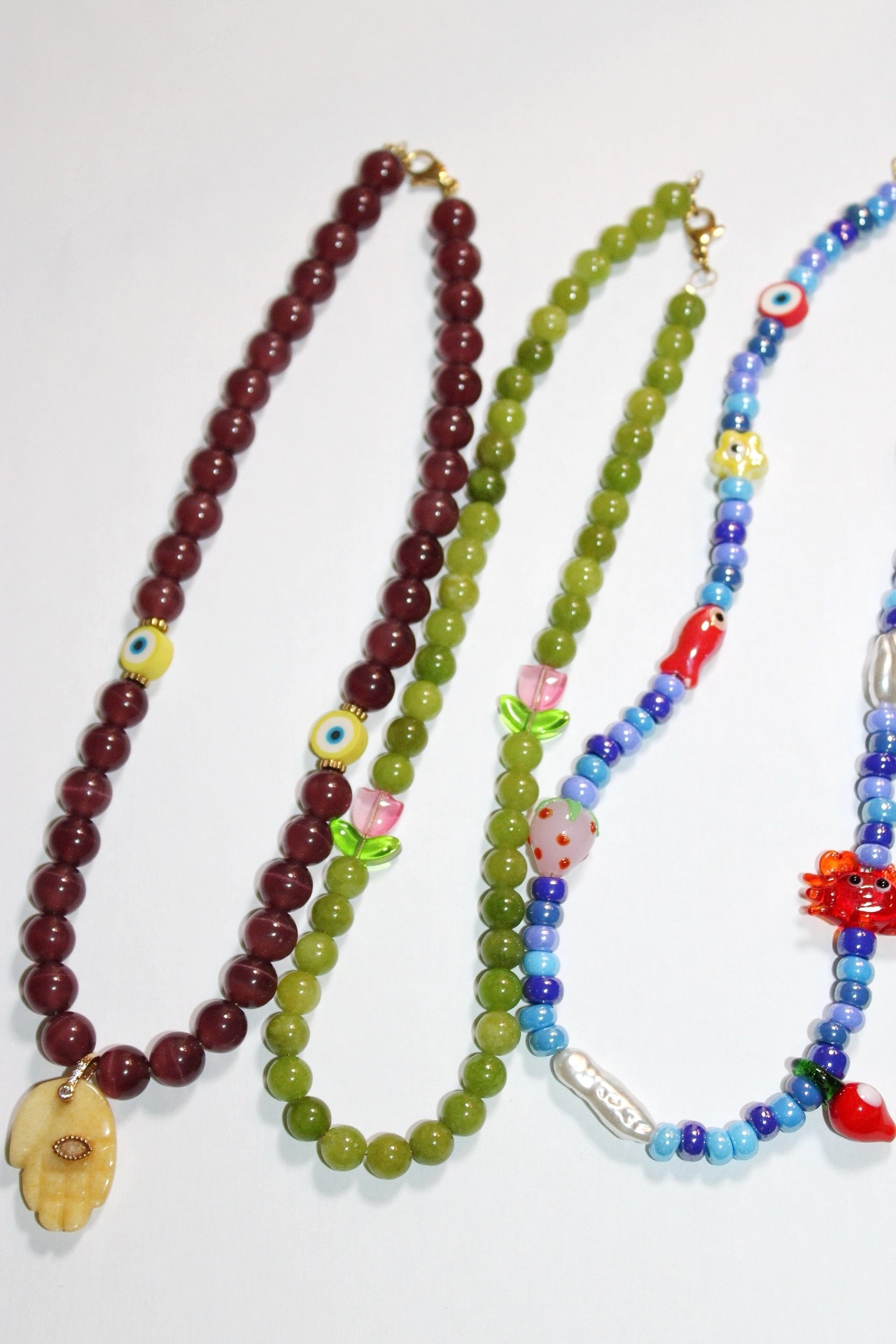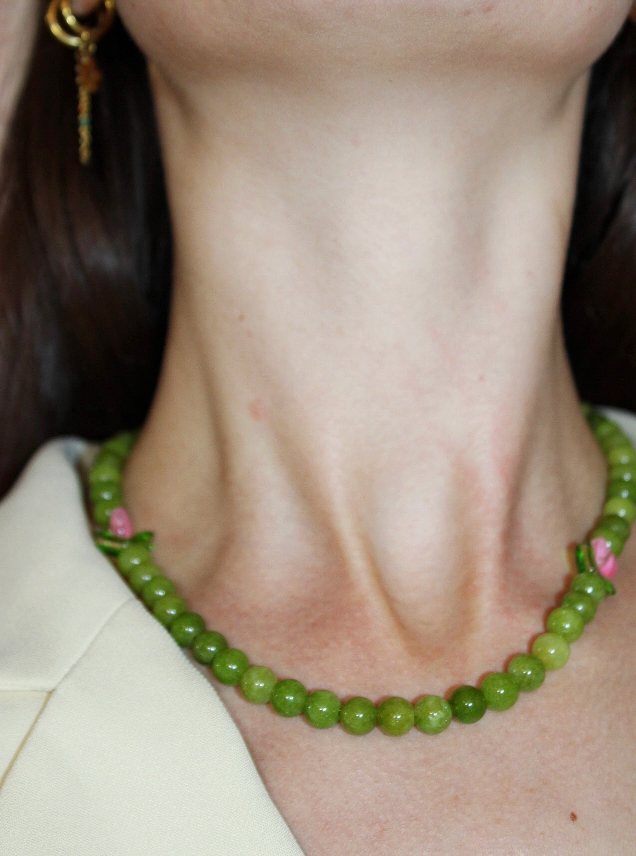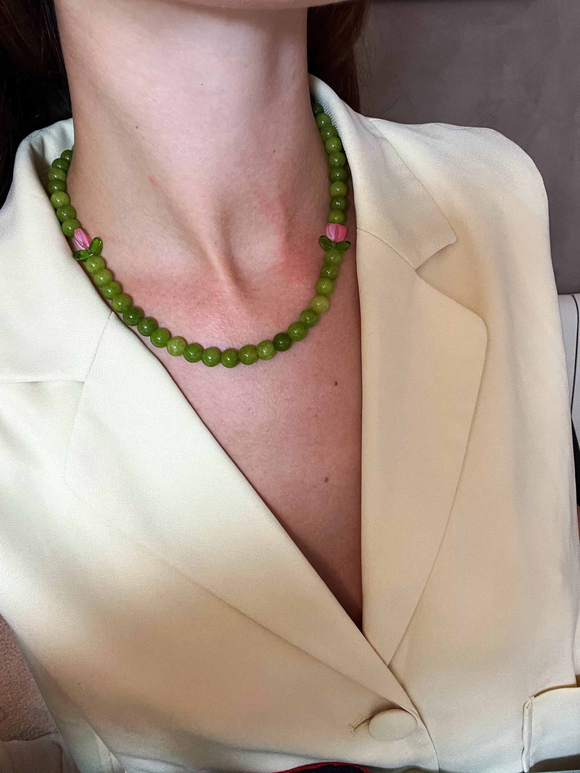 Collier en perles rondes vertes et charms tulipes, confectionné à la main avec soin dans un atelier de création de bijoux. Ce bijou élégant et intemporel combine la sobriété des perles vertes de péridot, et l'originalité du piment en verre, apportant une touche de personnalisation.